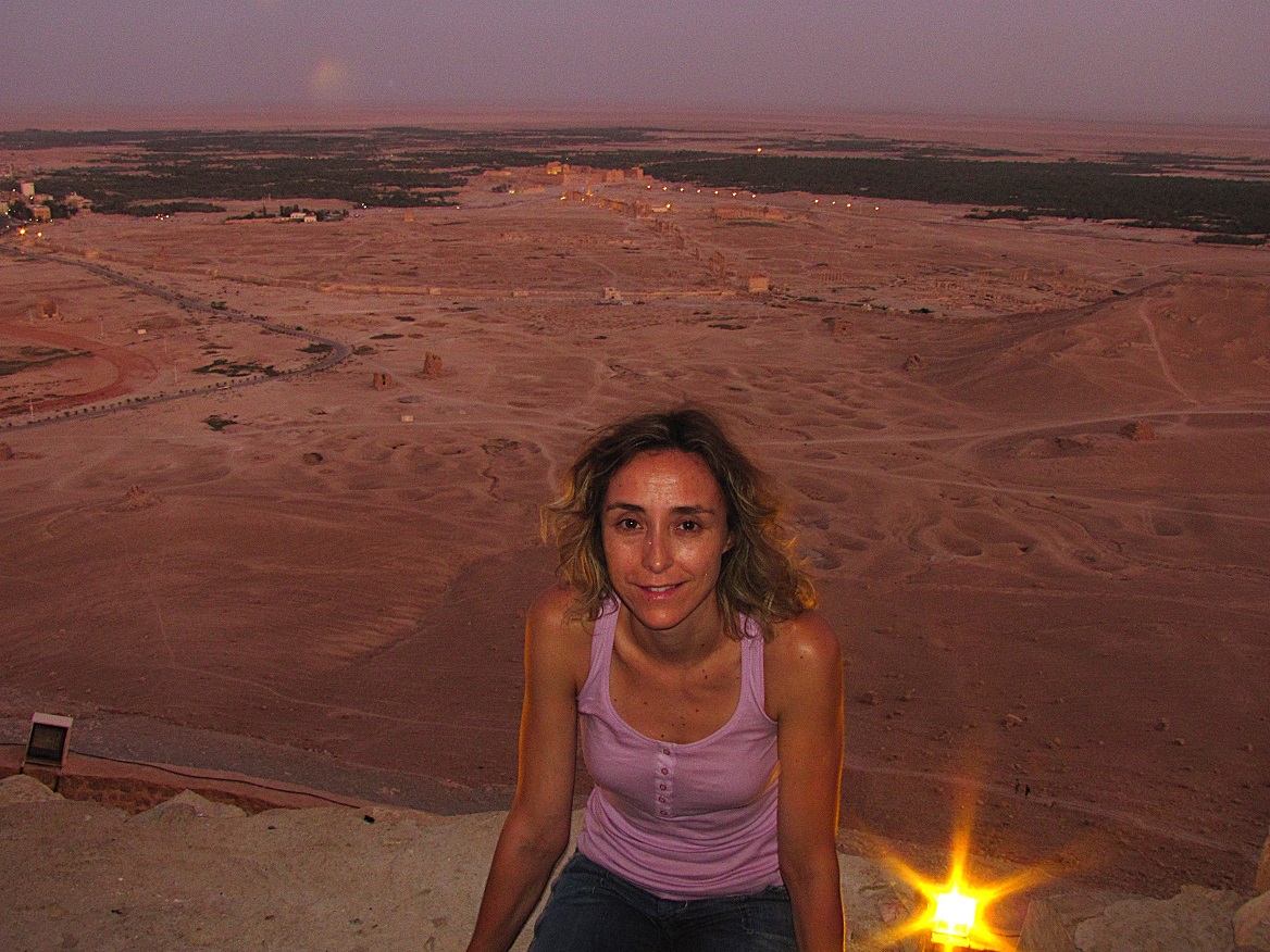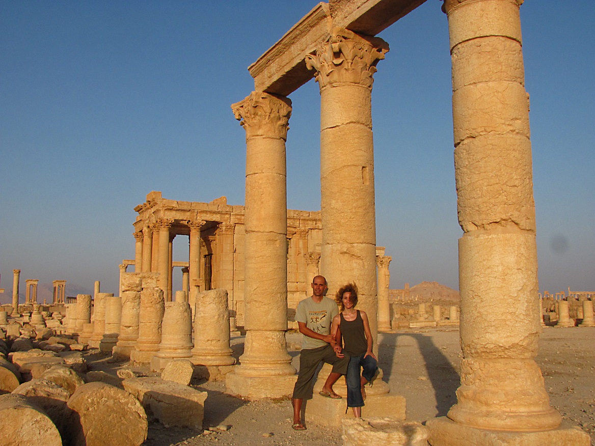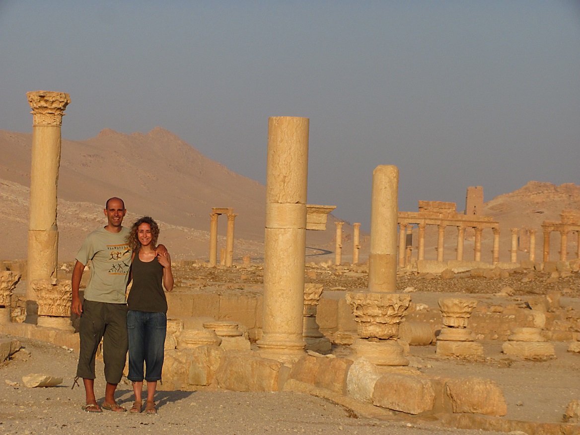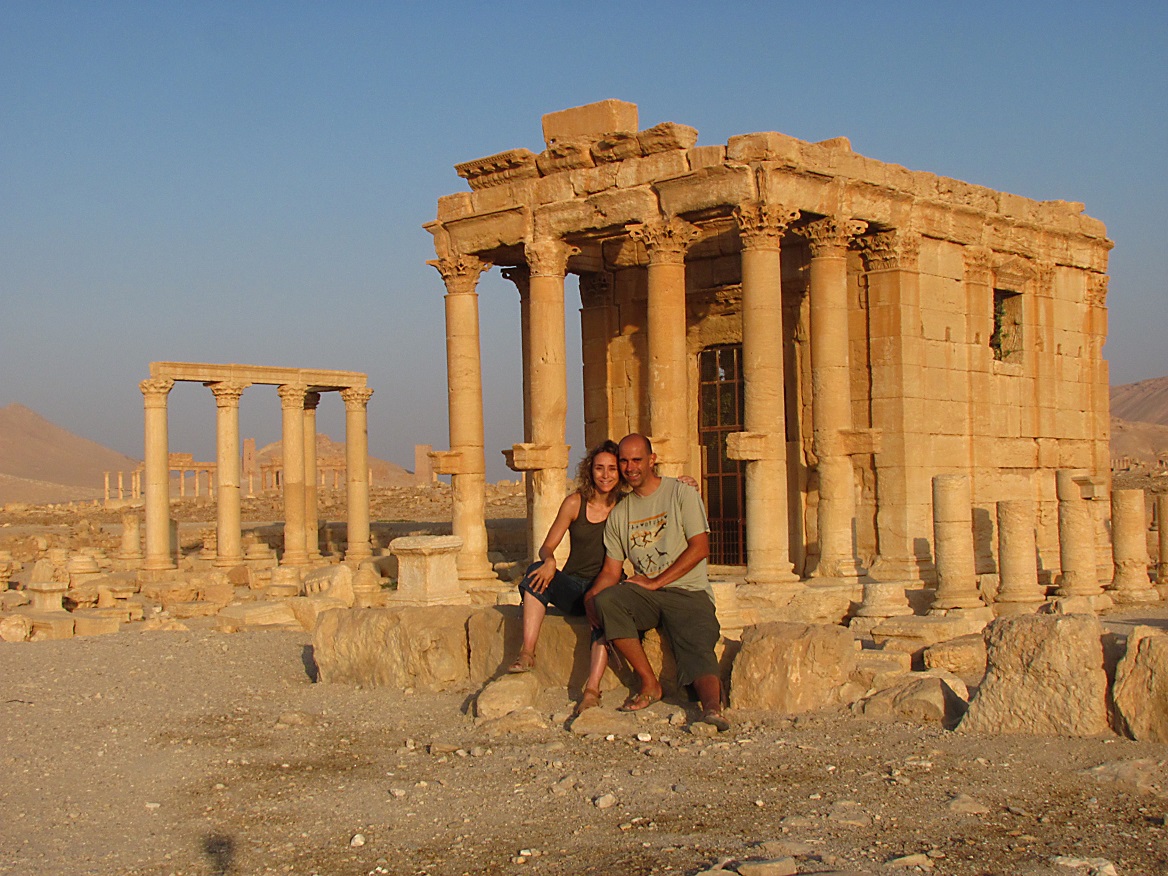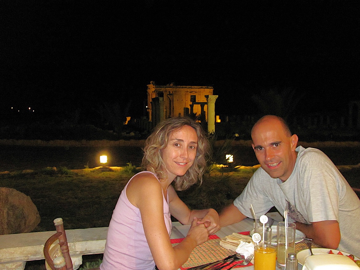 Nos quedamos allí, extasiados con esas vistas maravillosas, hasta que se hizo de noche. Entonces, nuestro conductor nos llevó de vuelta al hotel (y al resto de turistas, sus correspondientes conductores). Qué suerte alojarnos en el hotel Zenobia, en vez de en la ciudad. Pudimos cenar en terraza, delante del templo de Bel Shamin, como podéis ver en la foto de arriba a la derecha. Una auténtica maravilla. Y después de cenar, un paseito por las ruinas de Palmira, toda la ciudad para nosotros. Podías caminar libremente entre los templos y las columnatas, sintiendo el misterio de esas ruinas en la oscuridad de la noche.