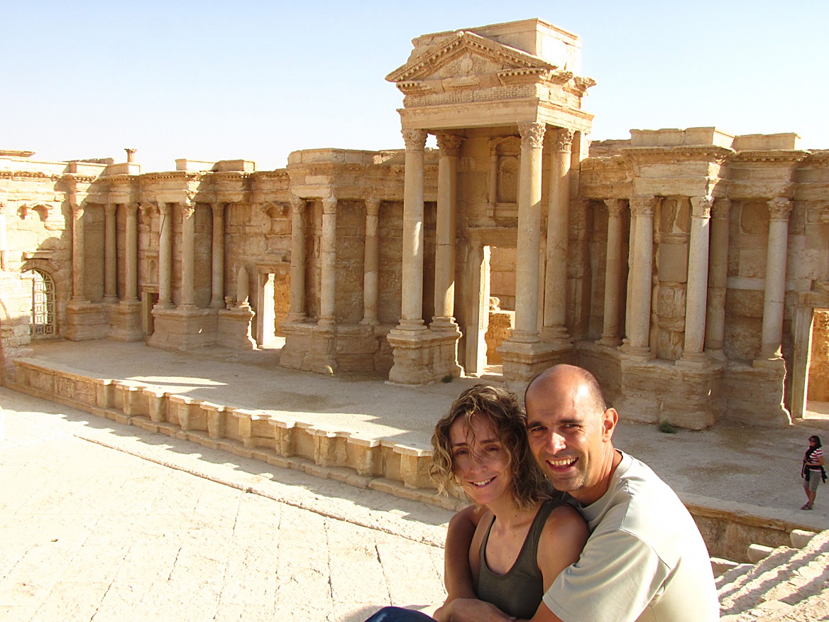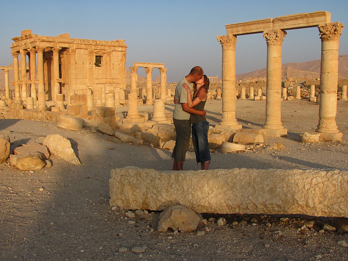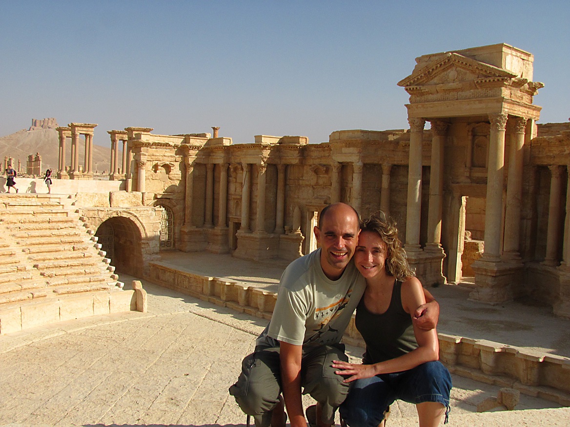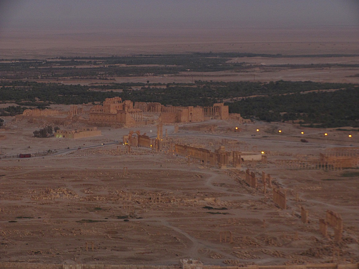 Nos quedamos allí, extasiados con esas vistas maravillosas, hasta que se hizo de noche. Entonces, nuestro conductor nos llevó de vuelta al hotel (y al resto de turistas, sus correspondientes conductores). Qué suerte alojarnos en el hotel Zenobia, en vez de en la ciudad. Pudimos cenar en terraza, delante del templo de Bel Shamin, como podéis ver en la foto de arriba a la derecha. Una auténtica maravilla. Y después de cenar, un paseito por las ruinas de Palmira, toda la ciudad para nosotros. Podías caminar libremente entre los templos y las columnatas, sintiendo el misterio de esas ruinas en la oscuridad de la noche.