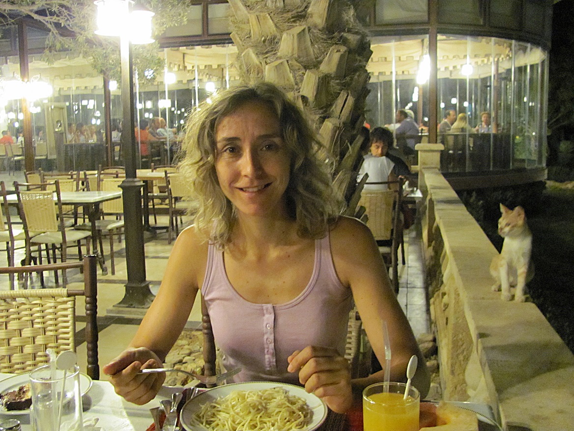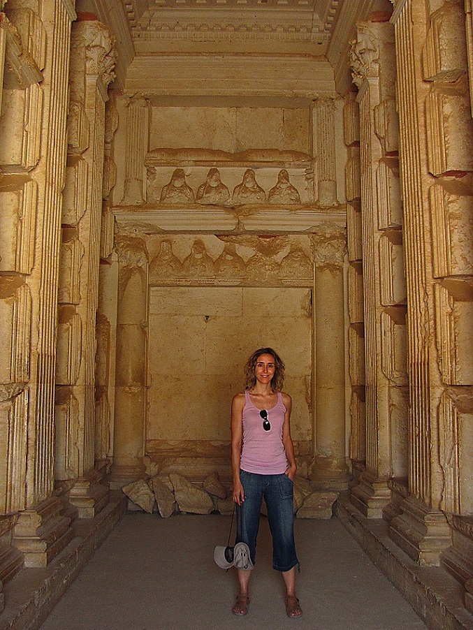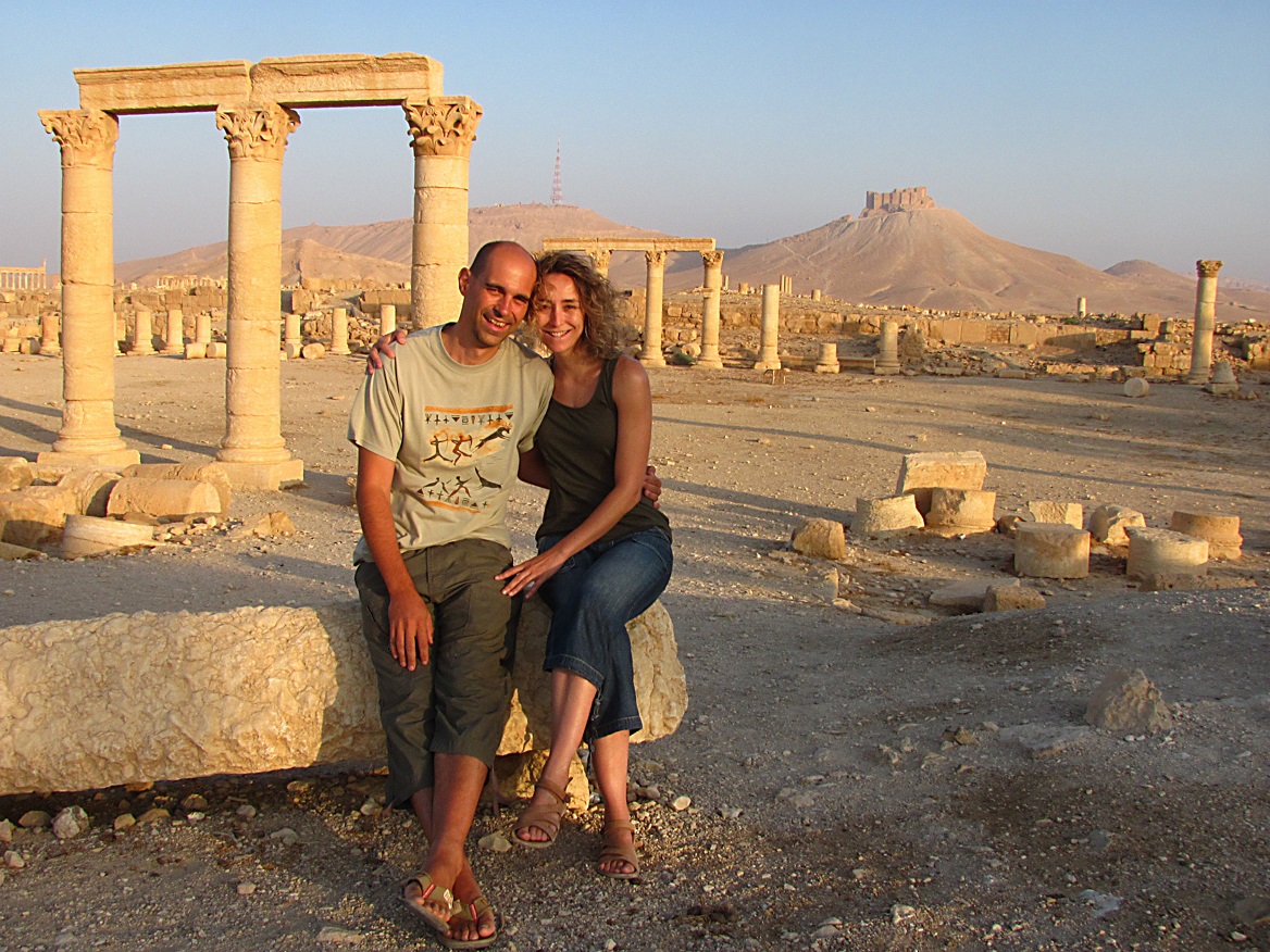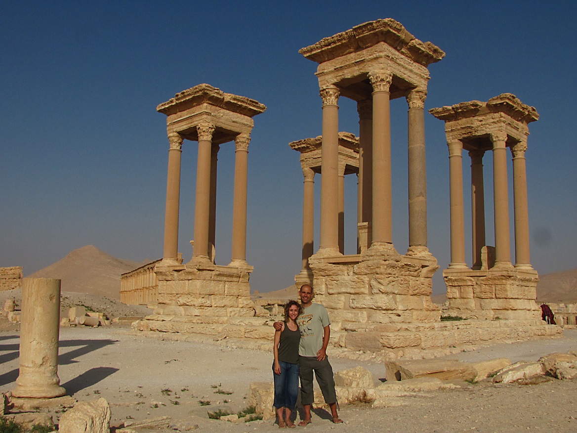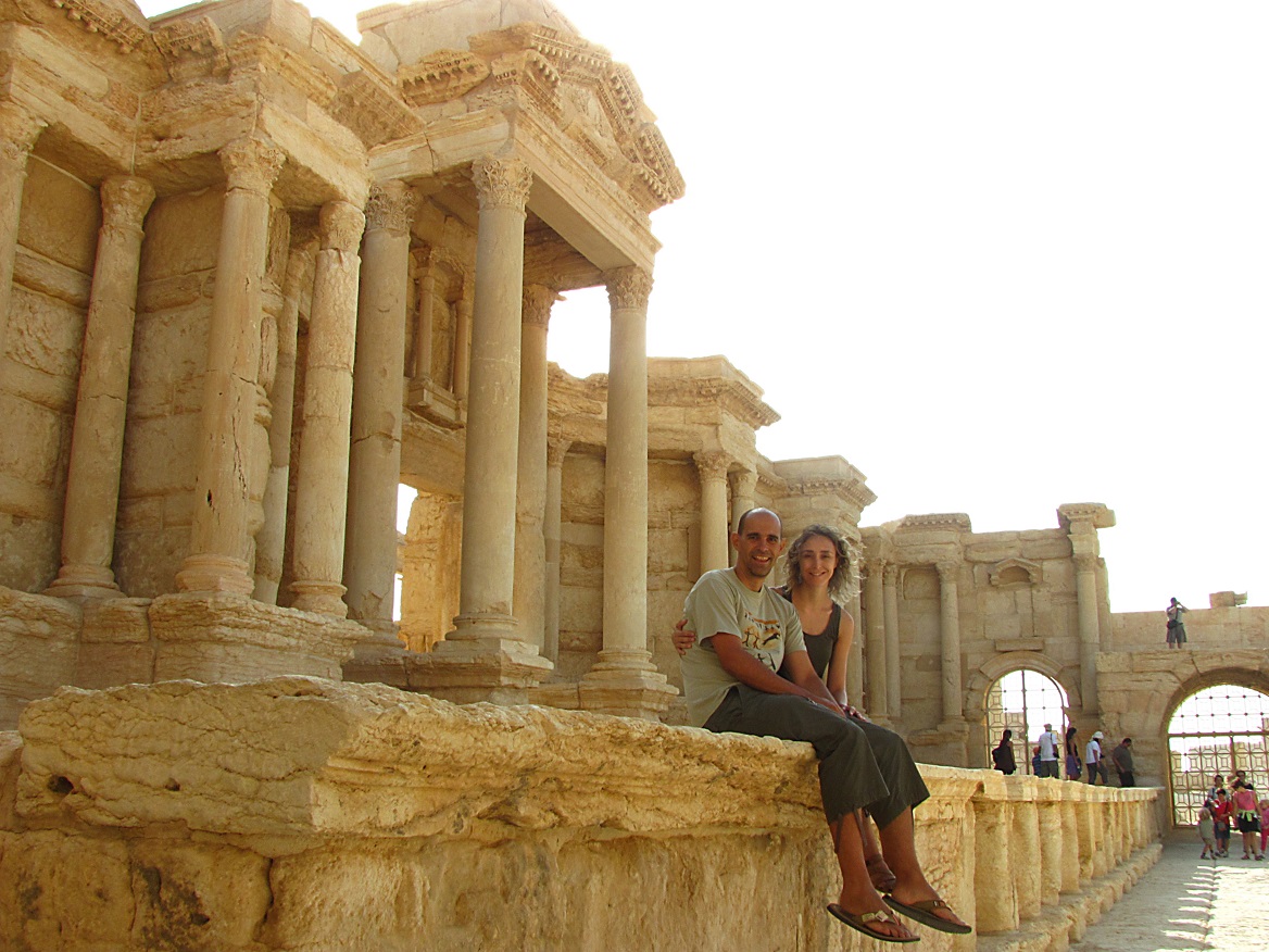 Nos quedamos allí, extasiados con esas vistas maravillosas, hasta que se hizo de noche. Entonces, nuestro conductor nos llevó de vuelta al hotel (y al resto de turistas, sus correspondientes conductores). Qué suerte alojarnos en el hotel Zenobia, en vez de en la ciudad. Pudimos cenar en terraza, delante del templo de Bel Shamin, como podéis ver en la foto de arriba a la derecha. Una auténtica maravilla. Y después de cenar, un paseito por las ruinas de Palmira, toda la ciudad para nosotros. Podías caminar libremente entre los templos y las columnatas, sintiendo el misterio de esas ruinas en la oscuridad de la noche.
