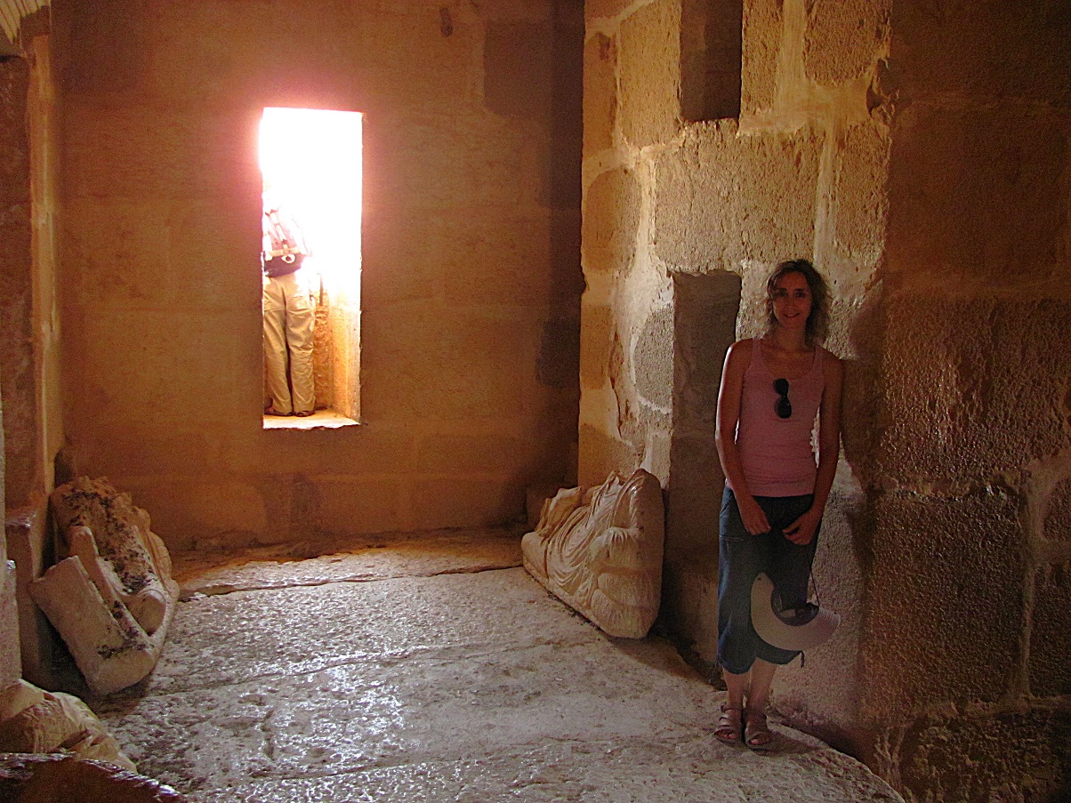 Abajo, fotos en el exterior, frente a su monumental entrada, y en el interior del templo. Los agujeros que se ven en las paredes son de los anclajes metálicos que se usaban para sujetar los paneles de mármol que lo cubrían y decoraban en su época de esplendor, y que han sido saqueados ya desde la antiguedad. Como podéis ver, estábamos completamente solos en tan magnífico lugar.