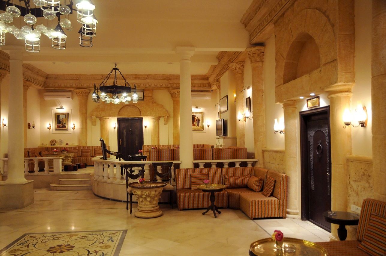 Es el único hotel que está dentro de las mismas ruinas de Palmira, y fue construido en la década de 1920. Nos costó 84 euros la noche, con desayuno. Aquí se alojaba, por ejempo, Agatha Christie, cuando venía a Palmira en sus viajes por Oriente Medio. Abajo podéis ver algunas imágenes del hotel, en las que se ve hasta qué punto está cerca de las ruinas. El hotel fue creado por la aventurera francesa Marga D'Andurain, que llevó una vida digna de una película y se enamoró de las evocadoras ruinas de Palmira, comprando un antiguo y desvencijado hotel y convirtiéndolo en el Hotel Zenobia, abierto a finales de los años 20. Podéis buscar la historia de esta mujer, una auténtica aventurera a la que fascinaba el arte y cultura del Oriente Medio de entonces. Si la pobre levantara la cabeza ahora... por lo que he podido ver en internet, el hotel sufrió muchos daños en la guerra civil, quien sabe si algún día será reconstruído y volverá a abrir sus puertas.