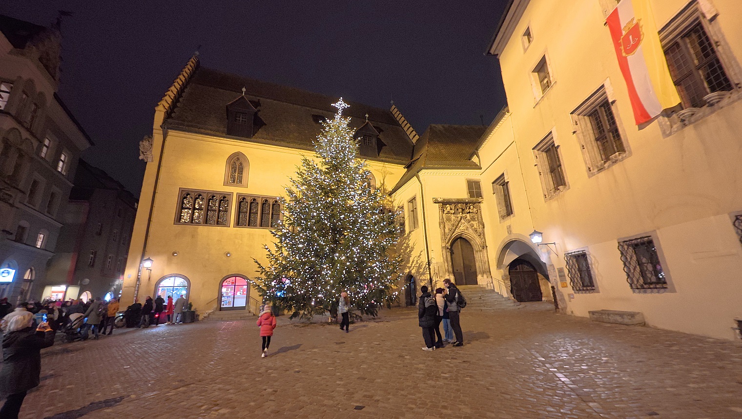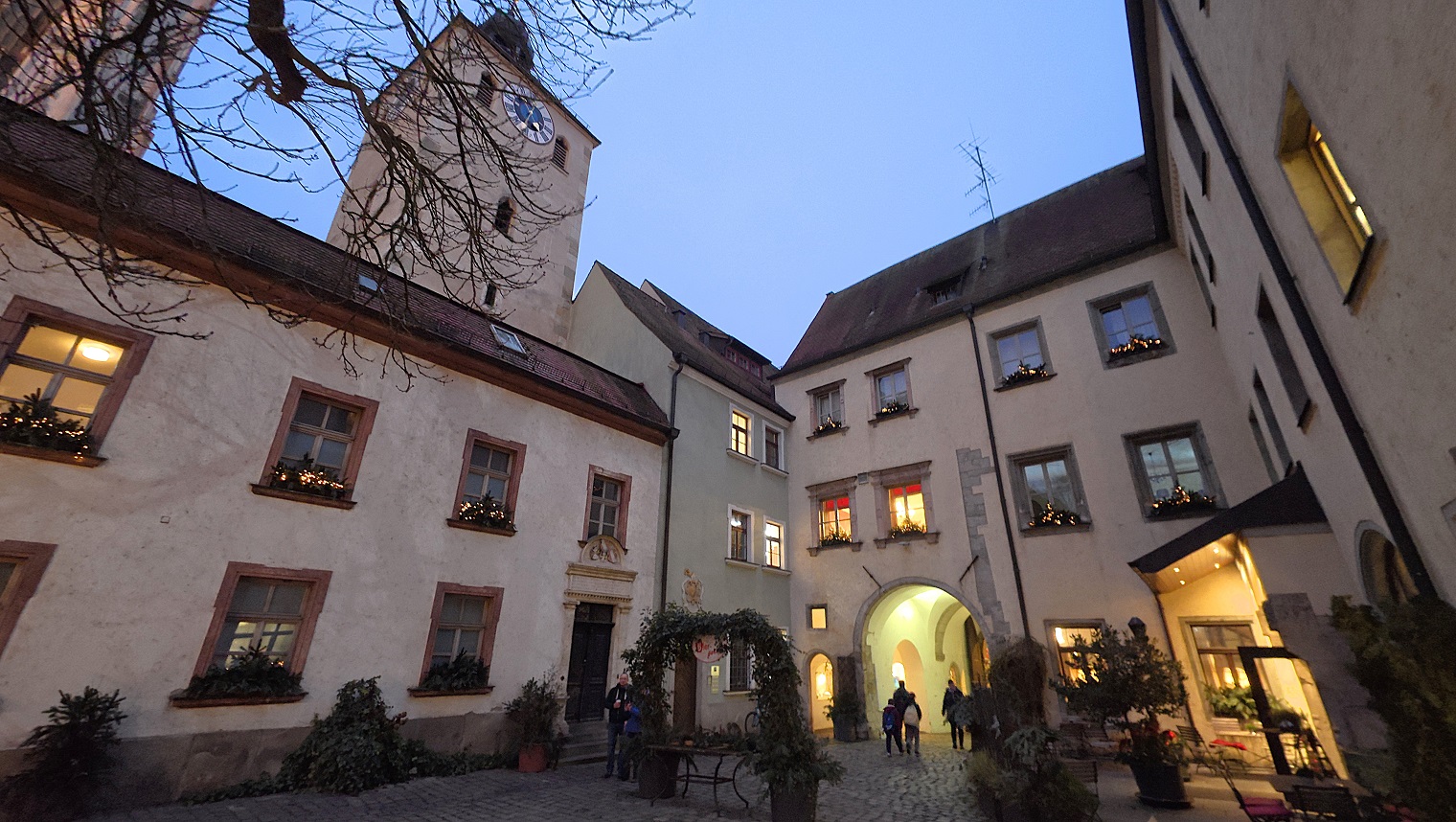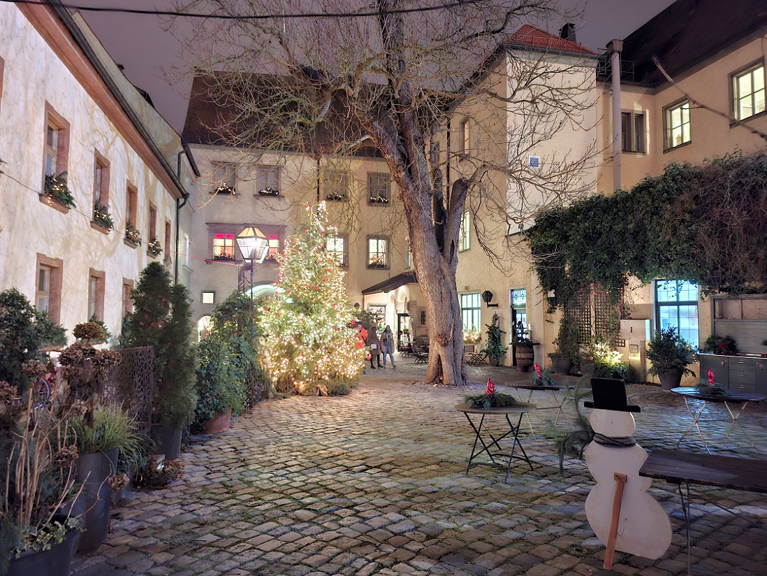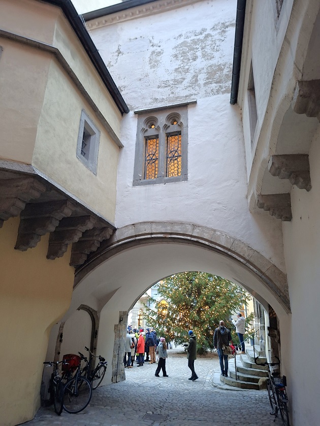 Lo siguiente que hicimos, ya de noche, fue meternos en una cafetería a merendar. Hay más de una por esas calles del casco histórico. Al lado de la cafetería, y al lado también de la catedral, está el edificio del obispado de Ratisbona, que tiene una especie de patio interior muy bonito, con un restaurante muy chulo, y un árbol de navidad. Es un rincón muy entrañable, como podéis ver en las fotos de abajo.