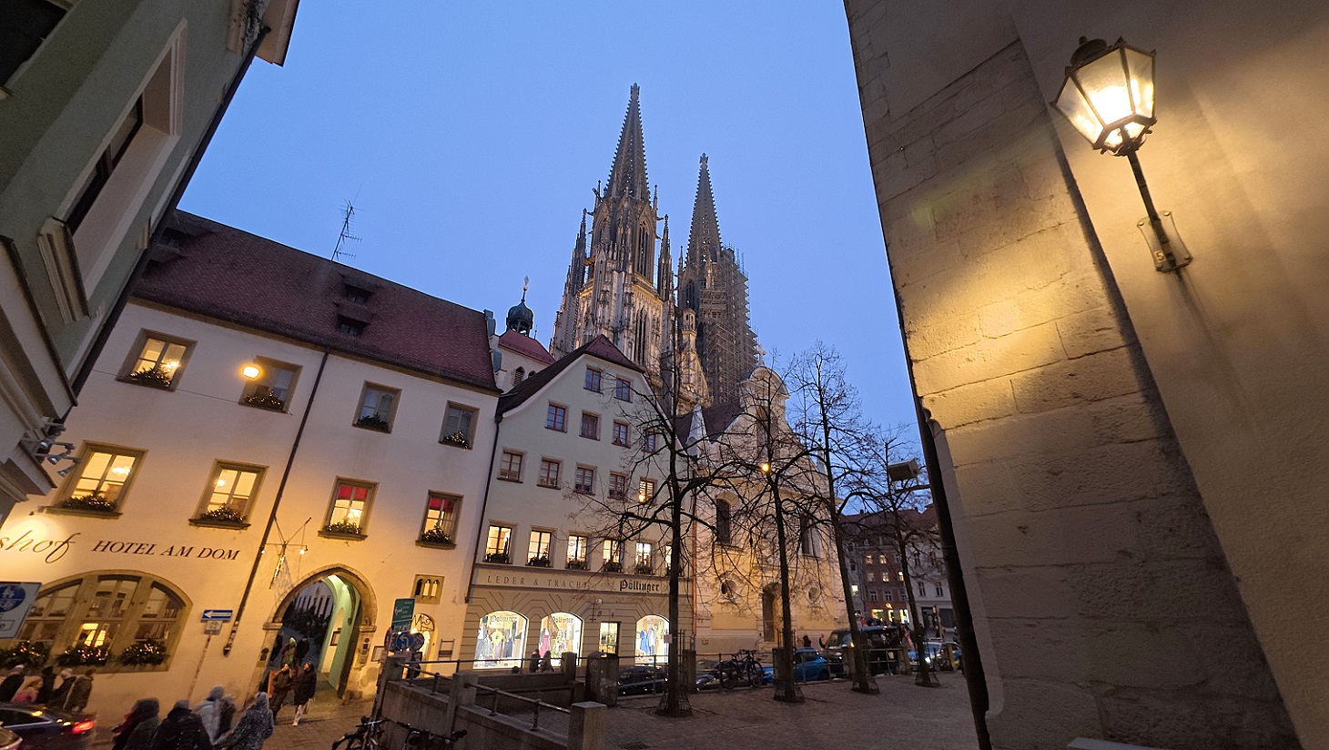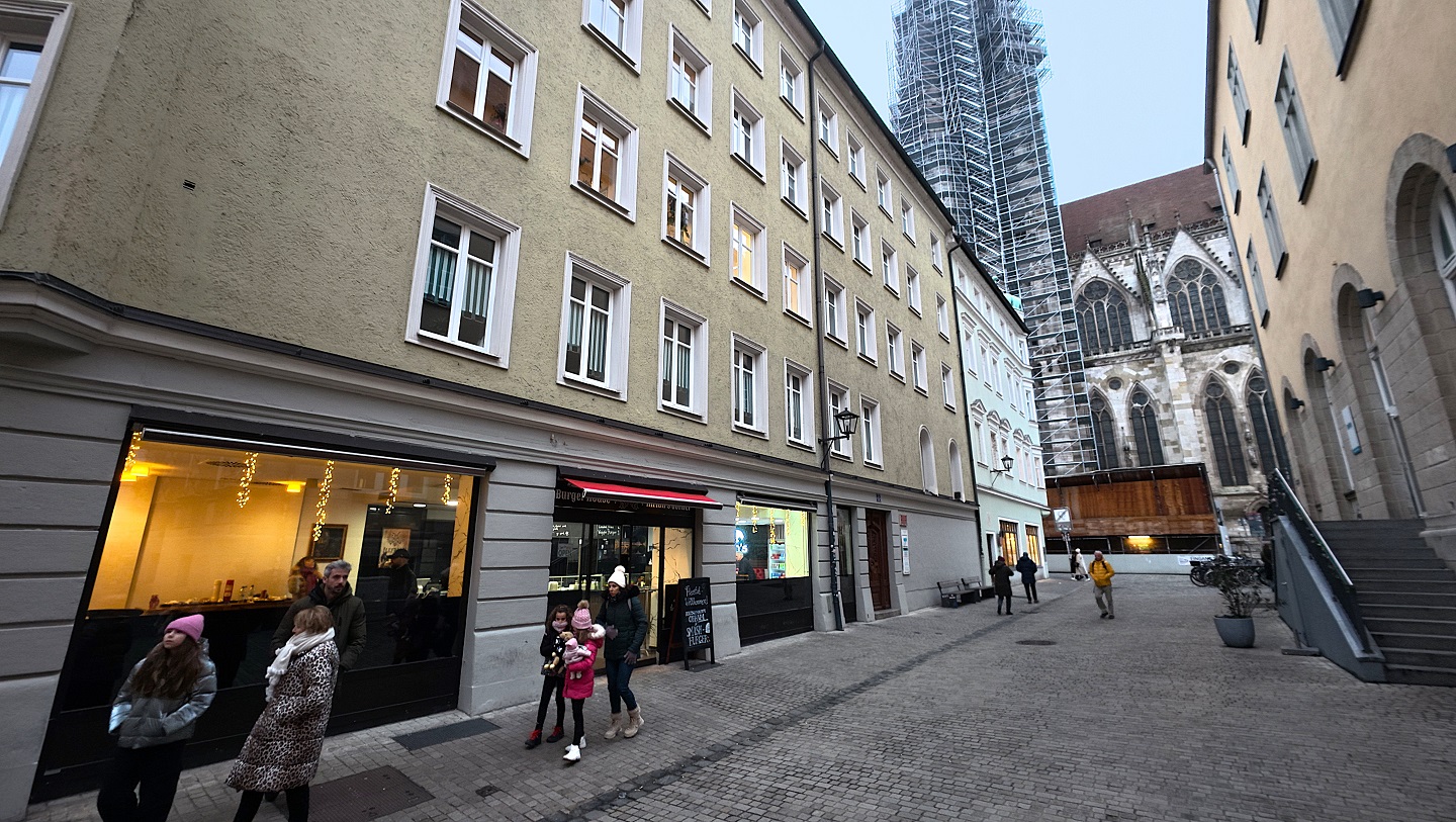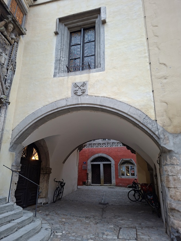 Lo siguiente que hicimos, ya de noche, fue meternos en una cafetería a merendar. Hay más de una por esas calles del casco histórico. Al lado de la cafetería, y al lado también de la catedral, está el edificio del obispado de Ratisbona, que tiene una especie de patio interior muy bonito, con un restaurante muy chulo, y un árbol de navidad. Es un rincón muy entrañable, como podéis ver en las fotos de abajo.