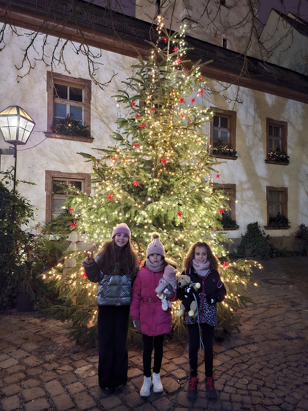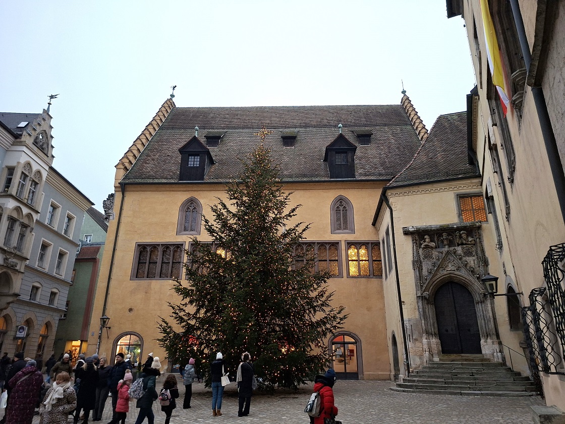 De camino hacia el puente pasamos por la plaza donde está el ayuntamiento viejo, un edificio medieval muy bien conservado, donde han puesto un gran árbol de Navidad. El edificio se puede visitar por dentro (nosotros no lo hicimos), y al parecer hay una gran sala gótica muy bonita, la cámara imperial, donde se reunía la asamblea de los representantes de cada uno de los estados que formaban el Sacro Imperio Germánico. Eso muestra hasta qué punto era importante esta ciudad.