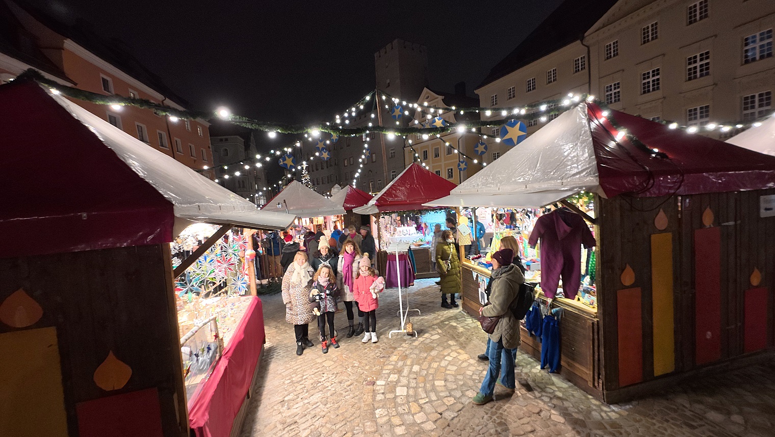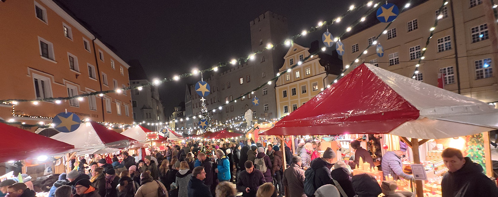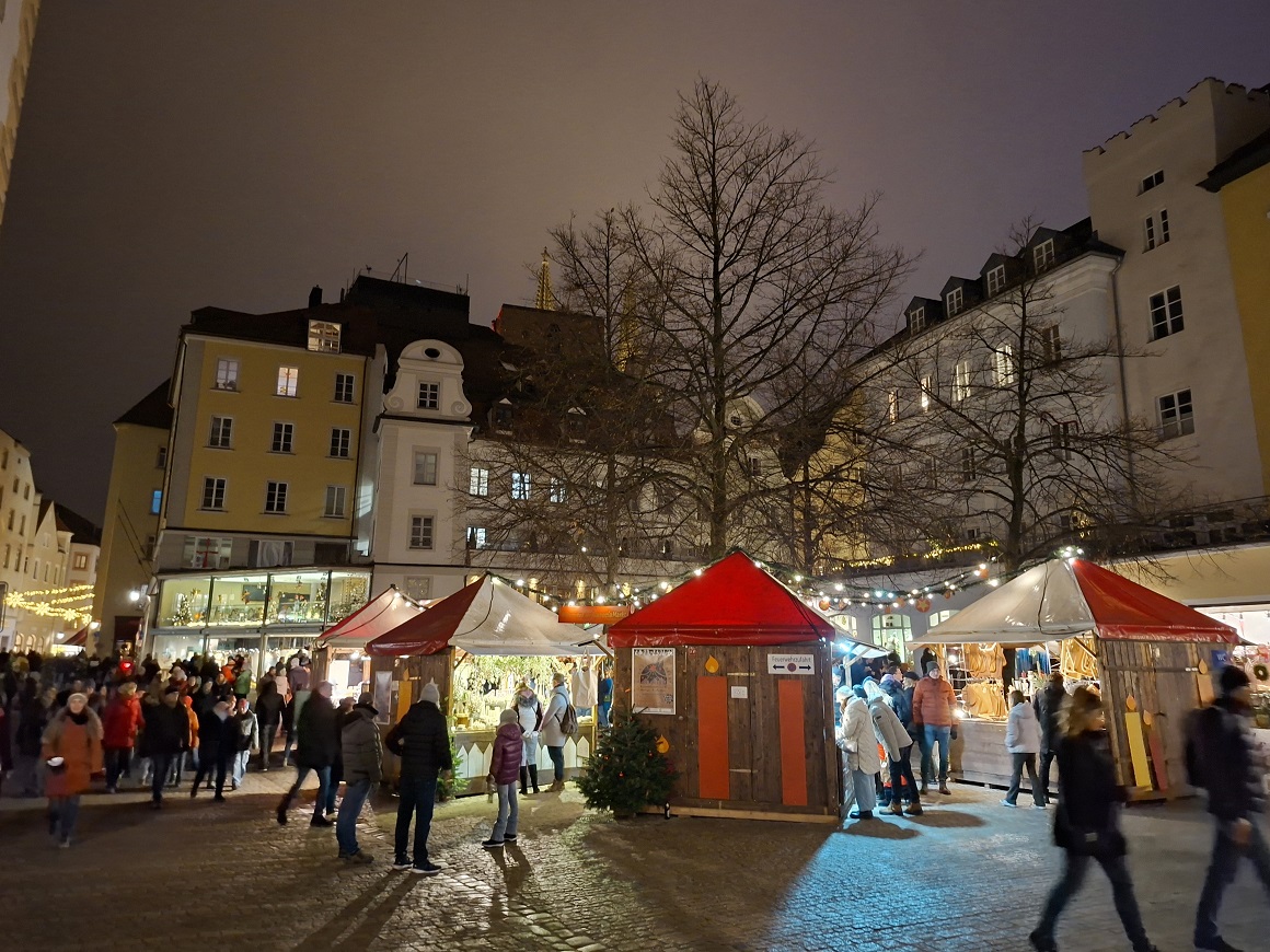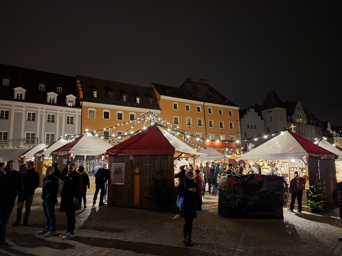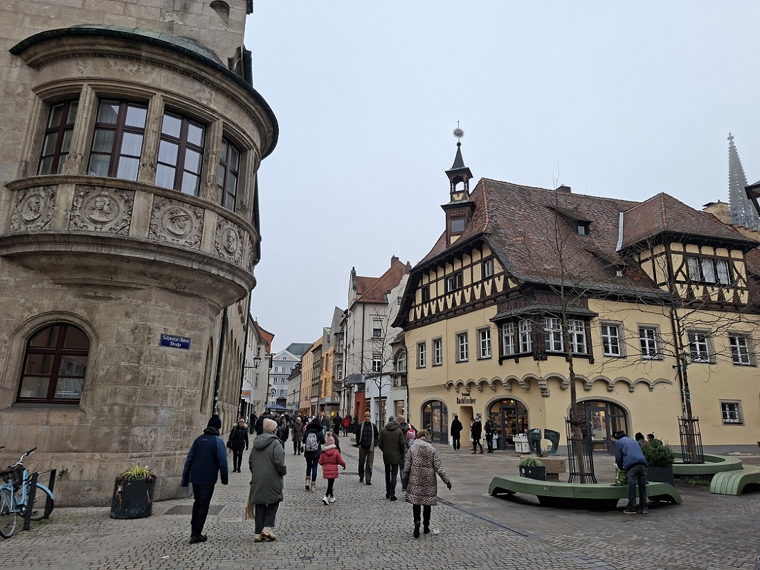 Desde aquí volvimos a la plaza del ayuntamiento, donde está instalado una parte del mercadillo navideño. La verdad es que estaba bastante petado de gente, dimos una vuelta entre los puestos, y seguimos nuestro paseo por la calle que se sale junto al edificio del ayuntamiento, la que se puede ver en la foto de abajo, a la izquierda del árbol de navidad. Esta calle desemboca enseguida en otra plaza de forma triangular llamada Haidplatz, donde está instalado la otra parte del mercadillo.
