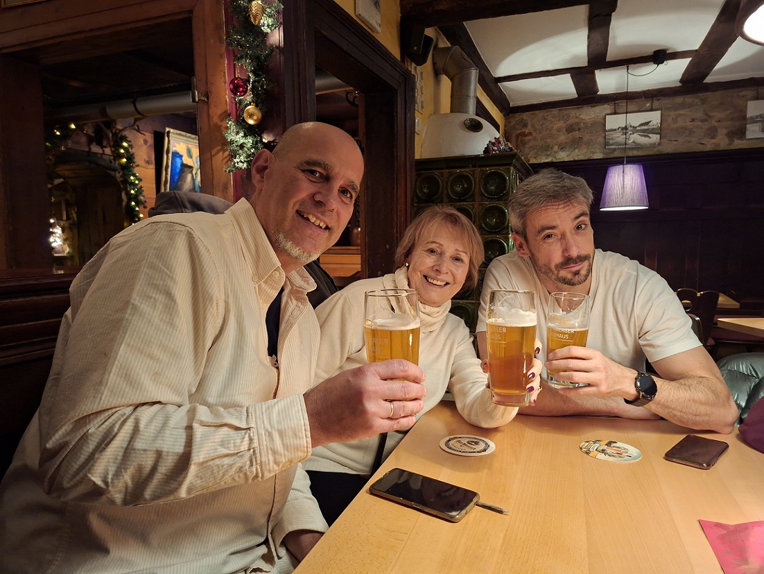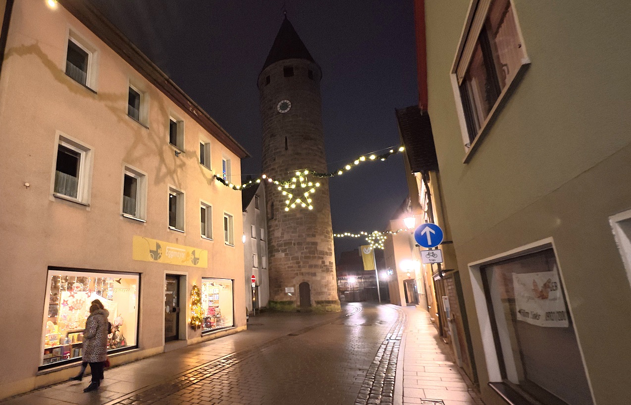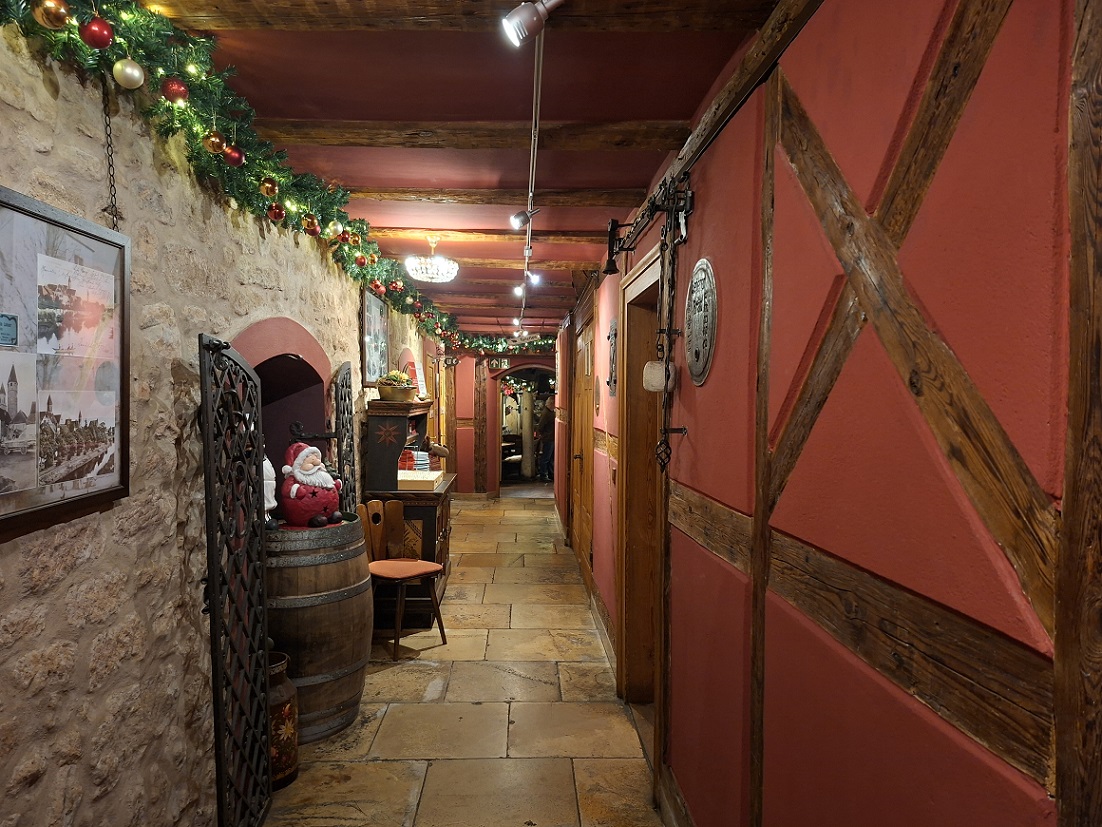 Cenamos en una antigua taberna que nos encantó, posiblemente el mejor sitio de todo el viaje. Estaba todo hecho en madera, y decorado con adornos navideños, pasamos un rato realmente agradable cenando allí, y la cerveza estaba realmente buena. El lugar se llama Lehner zum Storchennest y está justo frente a una torre medieval que se puede ver en la foto de abajo a la izquierda.