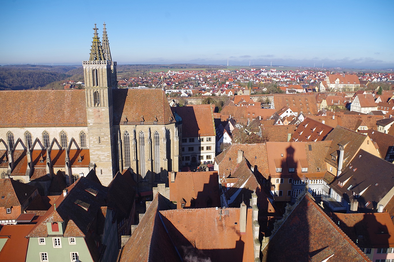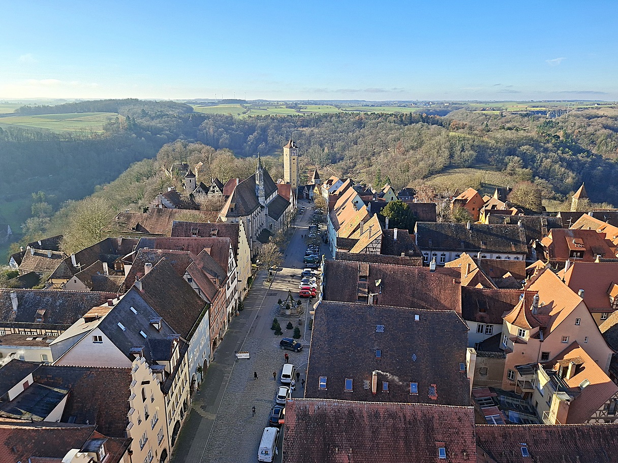 Arriba a la izquierda se pueden ver las dos torres que señalan la calle que habíamos seguido desde el exterior de la muralla para llegar a la Marktplatz. Subir hasta aquí arriba fue una experiencia fantástica, sin duda de lo mejor que se puede hacer en Rothenburg. La torre, al ser tan alta y delgada, resulta muy aérea, y como además está en el centro de la ciudad, las vistas son inmejorables hacia cualquier lado.