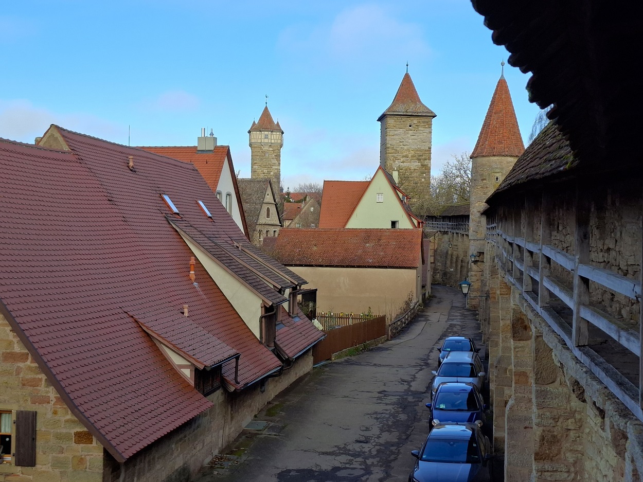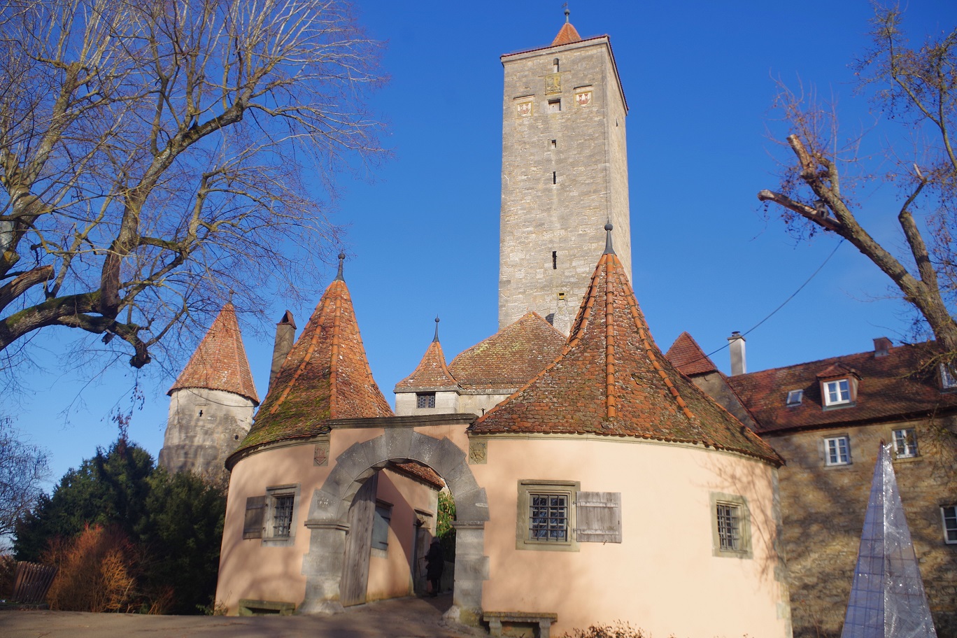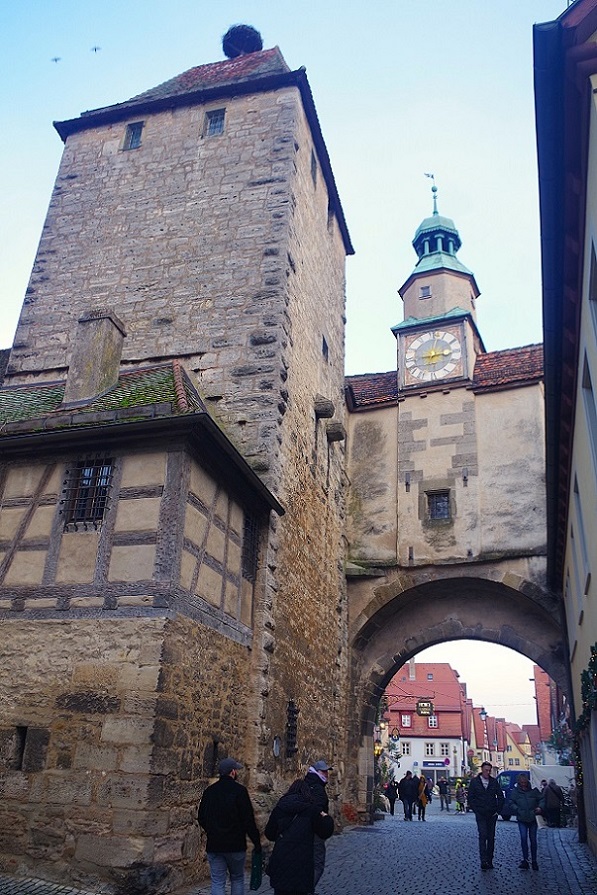 Dejamos las tiendas de navidad atrás y seguimos por esa calle hasta llegar a la puerta de la muralla que nos saca de la ciudad al recinto donde antiguamente estaba el castillo, y que hoy es un parque, llamado Burggarten. Abajo, una foto de esa monumental puerta (Burgtor) desde fuera. Desde aquí, hay amplias vistas del skyline de la ciudad, pero a esa hora estaba el sol de frente y se veía bastante mal. Desde allí fuimos por unas callejuelas muy solitarias, buscando el punto más fotografiado de Rothenburg.