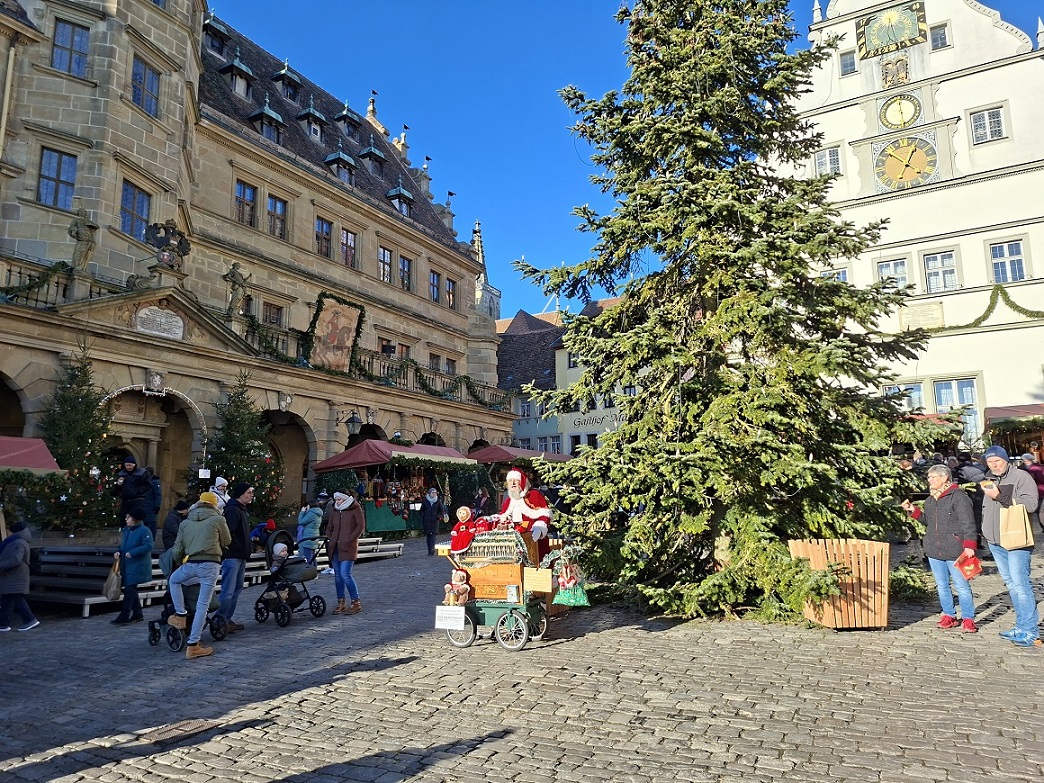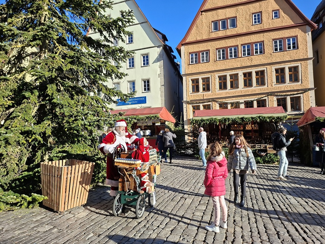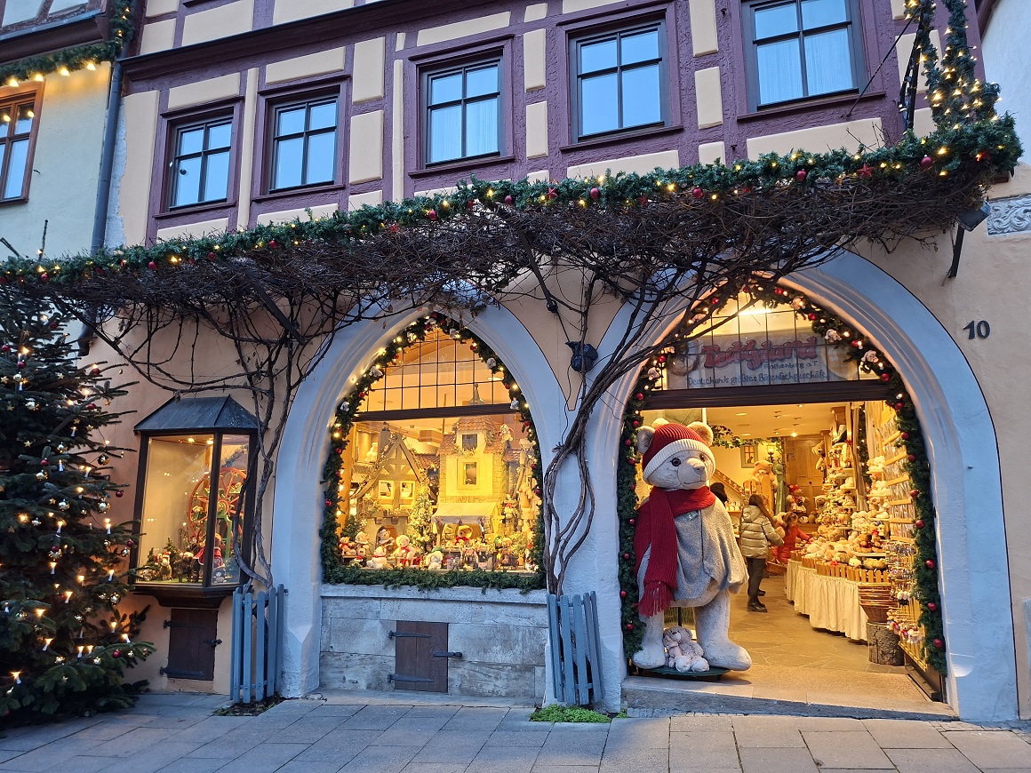 Una vez de nuevo abajo, decidimos pasear y recorrer el centro histórico el tiempo que quedaba hasta la hora de la comida, para aprovechar esa luz tan buena, y ya nos entretendríamos en el mercadillo navideño y las famosas tiendas de la navidad al caer el sol. Lo primero que hicimos fue ir por la calle que va hacia el oeste desde la plaza del ayuntamiento, Herrngasse. En esta calle, apenas hemos caminado unos metros desde la plaza, están las famosas tiendas de la Navidad de Rothenburg. No tiene pérdida, junto a la puerta de una de ellas hay aparcado una especie de autobús antiguo, como podéis ver en las fotos de abajo.