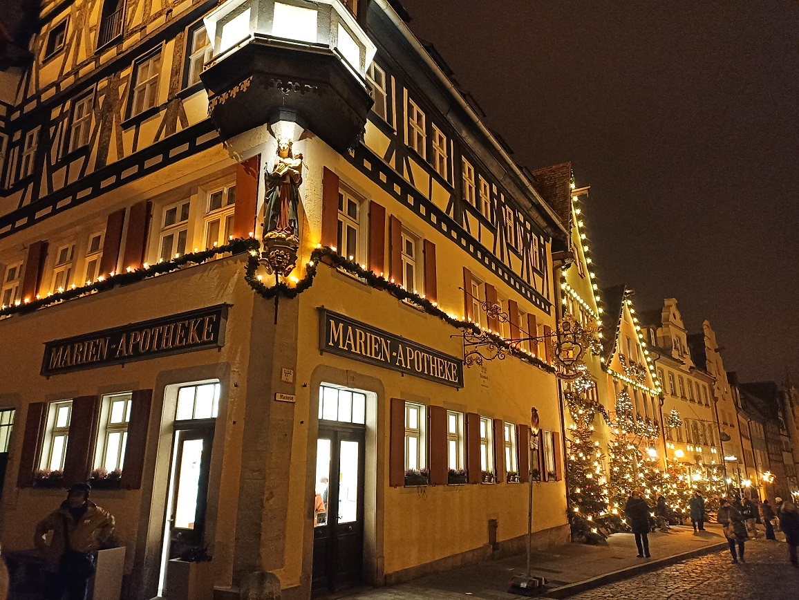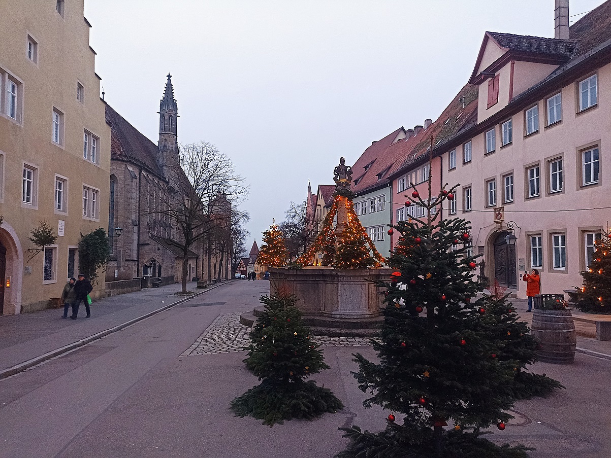 Y llegó el momento de dejar esta ciudad tan navideña. Desde la Marktplatz desandamos el camino hacia la puerta de la muralla por la que habíamos entrado. Fuimos mirando a ver si veíamos una cafetería donde tomar un café y un trozo de tarta, como el día anterior en Schwabisch Hall, pero ya a esas horas las que vimos estaban cerradas. Para ir a una cafetería tiene que ser antes de las seis de la tarde. Abajo, las últimas fotos que sacamos en nuestra visita a Rothenburg ob der Tauber. La verdad es que ya con la noche caída, la ciudad está realmente bonita con toda la iluminación navideña que tiene.