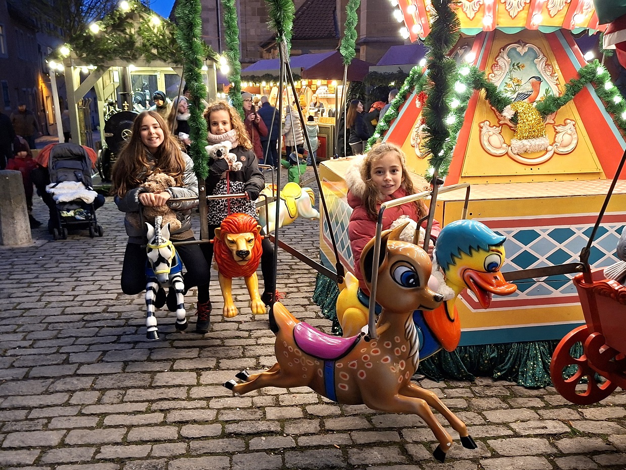 La verdad es que el ambiente navideño es total, tan solo faltaba que estuviera nevando un poco. No pude resistirme a comerme un bocata de salchichas. Las niñas se montaron en un carrusel junto a la catedral, y estuvimos un rato curioseando entre las diferentes casetas del mercadillo. Pensaba que iba a estar mucho más lleno de gente, como el de Ratisbona, pero aunque había gente, se estaba bien, no era agobiante.