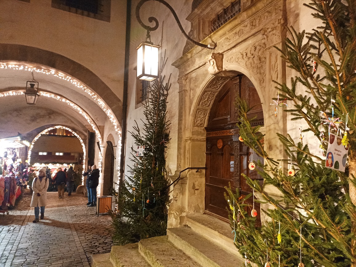 Esa calle lleva directo hasta la Marktplatz, la plaza del ayuntamiento, donde está montado el mercadillo navideño. Allí está el imponente edificio del ayuntamiento, que tiene una torre a la que se puede subir. No nos lo pensamos dos veces, y decidimos hacer eso lo primero, aprovechando que había buena luz. Seguramente por ser lunes, no había demasiada gente en el mercadillo, se estaba bastante bien.