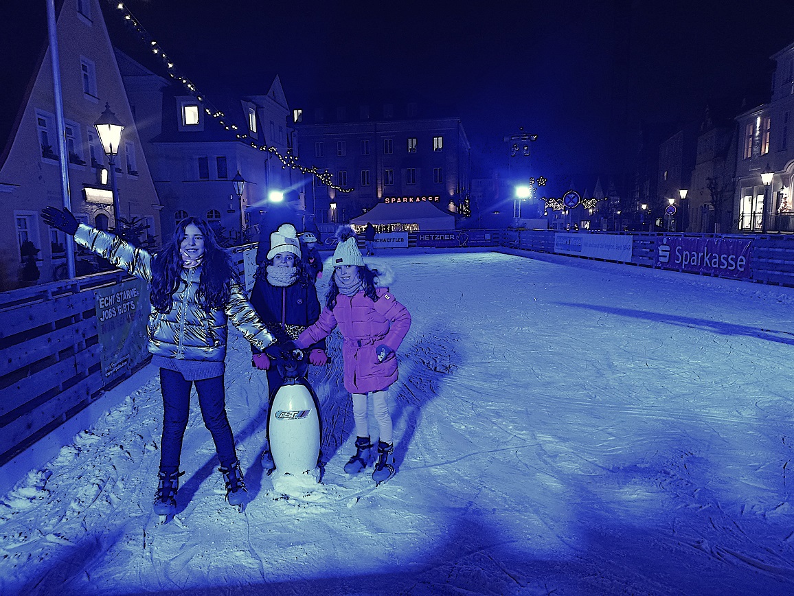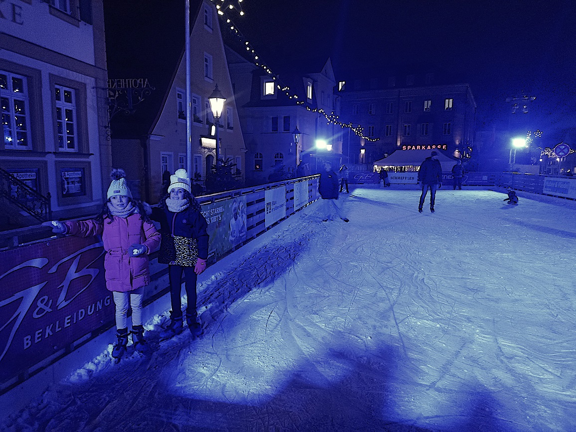 Hasta Gunzenhausen, donde teníamos nuestro alojamiento, teníamos como tres cuartos de hora de viaje. Al llegar, aparcamos sin problema en el centro, y antes de ir a cenar las niñas estuvieron un rato patinando en la pista de hielo que habían puesto en la calle principal. Al no ser Gunzenhausen un sitio turístico, estábamos casi solos, y eso que es un pueblo con cierto encanto, como se puede ver en las fotos de abajo.