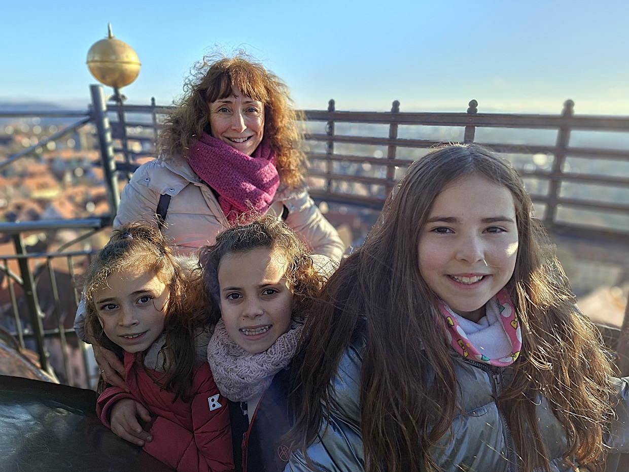 Afortunadamente, en la misma plaza encontramos un restaurante muy bonito donde enseguida nos prepararon una mesa. Se trata del restaurante Ratsstube, ubicado en uno de los edificios medievales del siglo XV que podéis ver en la foto de abajo a la izquierda, que sacamos desde la torre. Es el edificio amarillo de la derecha. Las niñas ya están contentas, están sentadas y pueden sacar sus cuadernos y rotuladores para pintar mientras nos traen la comida.