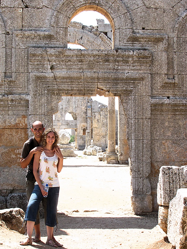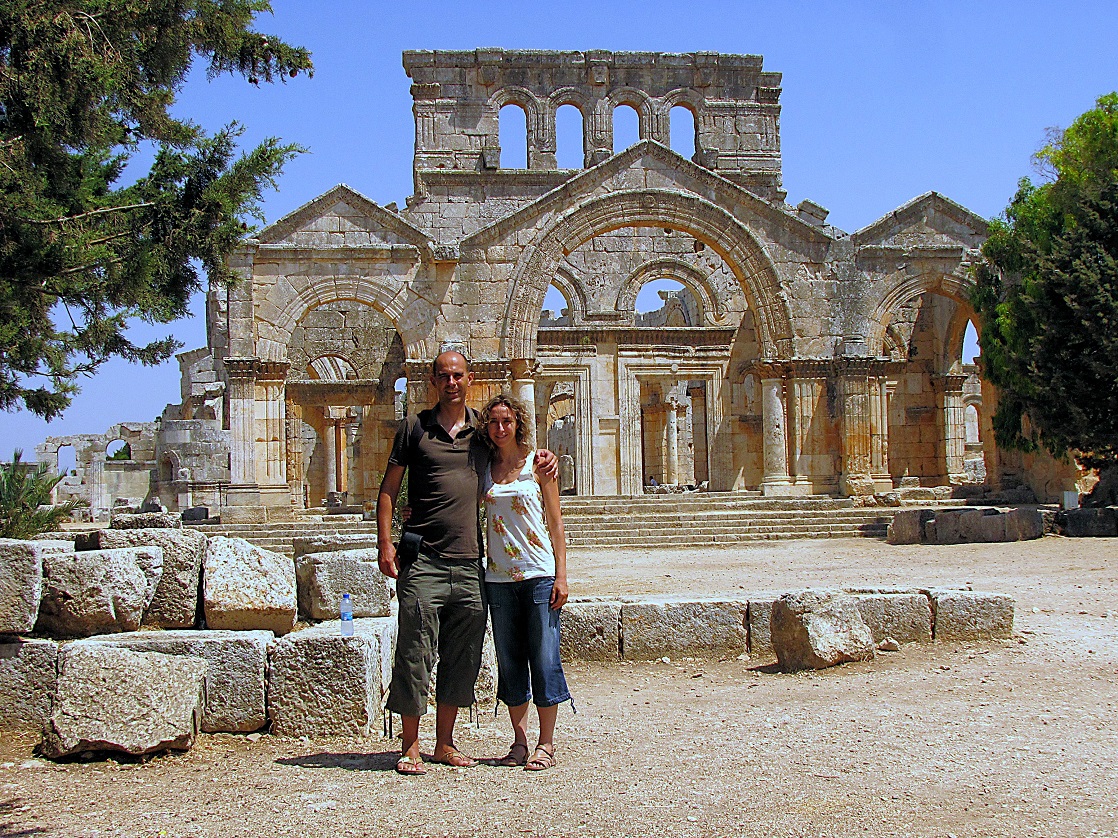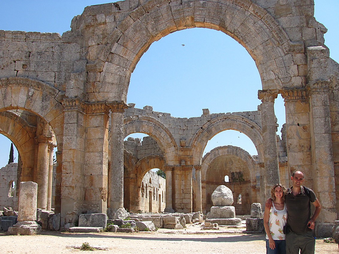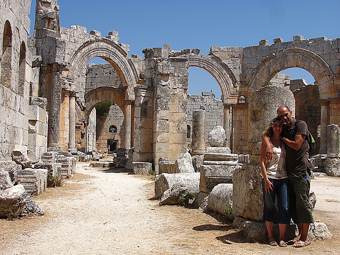 Cuando estamos de camino en ese primer taxi, chapurreando en inglés con el conductor nos pregunta por nuestro plan del día, y al decirle lo que queremos hacer, nos dice que él mismo nos puede llevar hasta la basílica, esperar allí a que acabemos la visita, y traernos de vuelta al hotel. Lo cierto es que sonaba muy bien. Después de un pequeño regateo, enseguida negociamos un precio justo para ambos, y en menos de una hora (35 km desde Alepo) estábamos junto a la basílica. Nuestro conductor se quedó descansando en el coche mientras nosotros fuimos a descubrir este magnífico monumento olvidado por el mundo, ya que no había apenas nadie más.