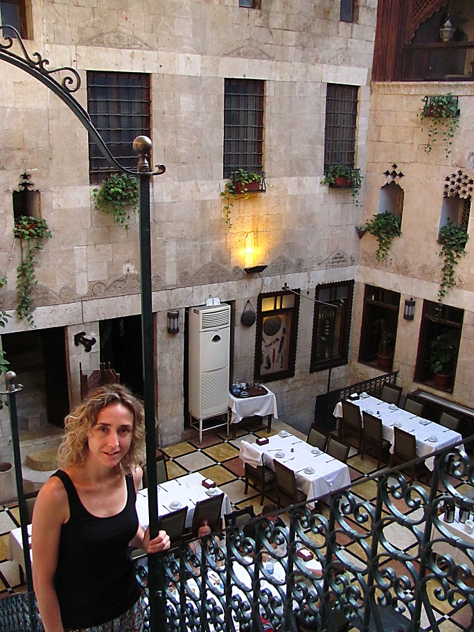 Ese día nos levantamos en nuestro maravilloso hotel de Alepo (Martini Dar Zamaria), un antiguo palacio otomano del siglo XVIII enclavado en el barrio de Al-Jedaida, en el corazón de la zona histórica de Alepo. Nos costó 224 euros con desayuno por tres noches. Después de un buen desayuno en el patio central de este antiguo palacio, salimos a la calle para coger un taxi hacia la estación de autobuses. Desde allí, sale un autobús que nos deja en el pueblo más cercano a la basílica de San Simeón, donde tendremos que buscar otro taxista que nos lleve.