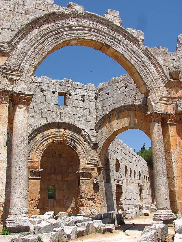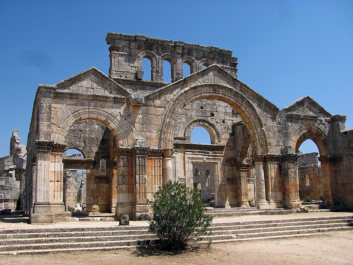 ¿Y por qué les dio por construir una iglesia tan grandiosa y magnífica aquí, en lo alto de una colina en mitad de la nada? Hay que remontarse a la primera mitad del siglo V, cuando un asceta cristiano radical (muy radical) llamado Simeón decidió vivir una vida de meditación alejado de todo tipo de lujos y de contacto con otros semejantes. Y para eso no se le ocurrió otra idea mejor que vivir en lo alto de una columna. Mandó construir una columna de piedra, y vivió allí durante nada menos que 37 años. Le subían los alimentos con una cuerda y una polea, y no necesitaba nada más. Daba igual que hiciera calor o frio, él estaba allí arriba, en su columna, meditando y rezando. Por eso se le llama Simeón el estilita, ya que columna en griego se dice "stylos".
