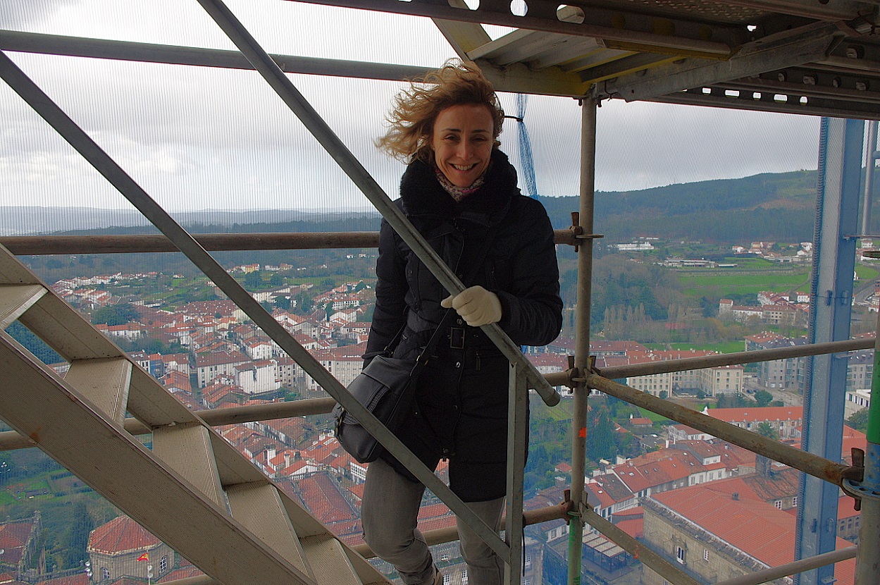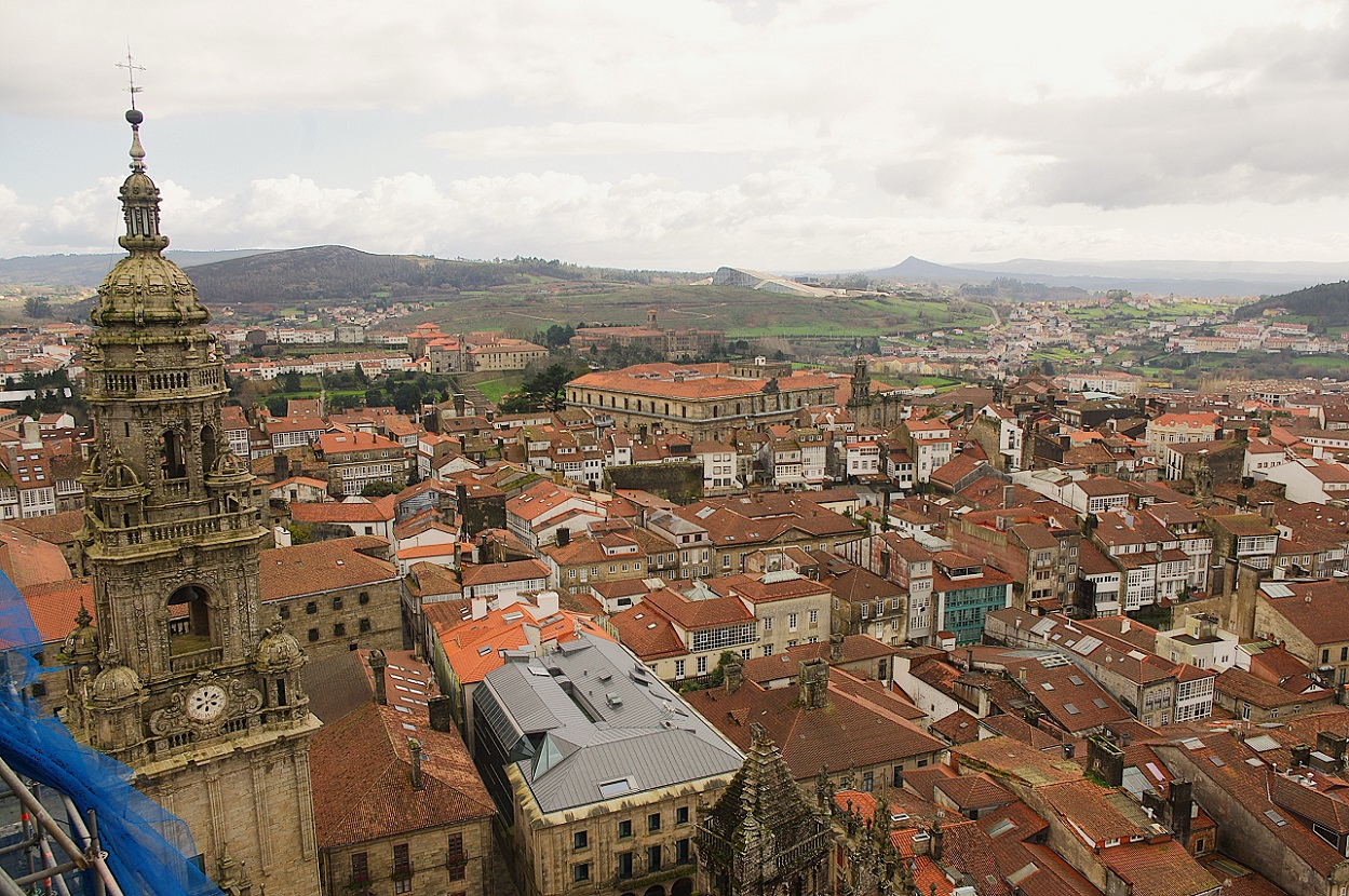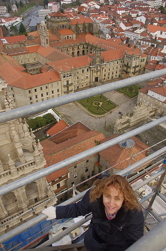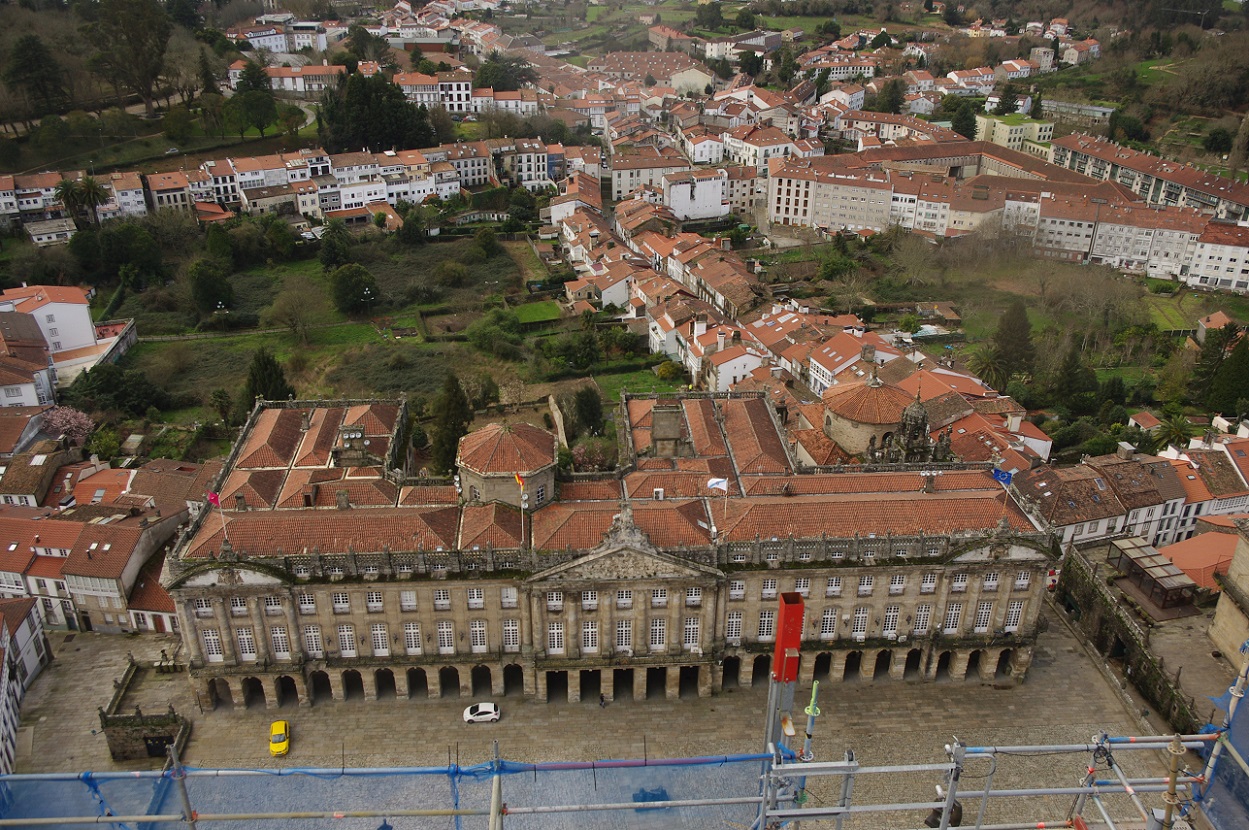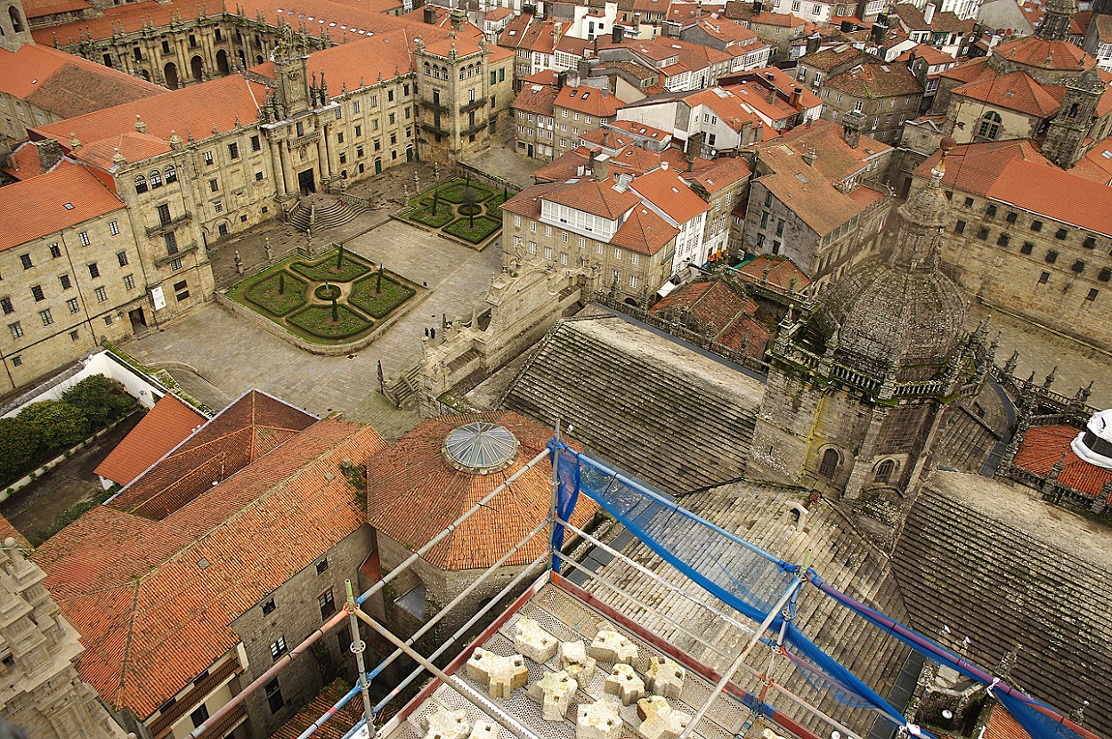 Y a la hora convenida, empezamos nuestra visita a la catedral, ascendiendo poco a poco por los andamios exteriores. Abajo a la izquierda, una magnífica vista, aún a poca altura, sobre los edificios al norte de la catedral. Gran parte de los tejados rojos corresponden al monasterio de San Martín Pinario, y al fondo se ve la iglesia con sus dos torres del convento de San Francisco, y justo a la izquierda, la enorme y monumental facultad de Medicina.
