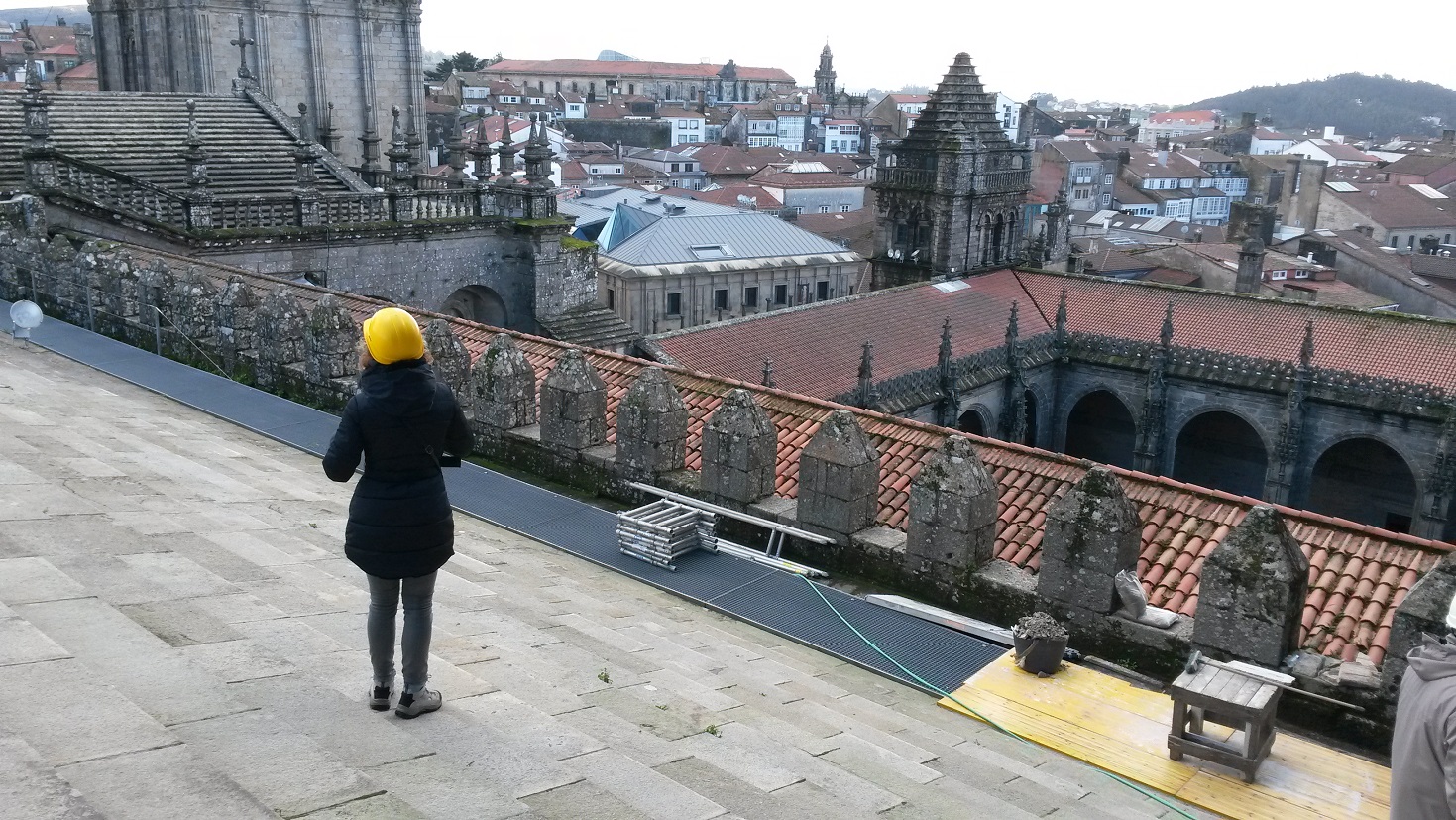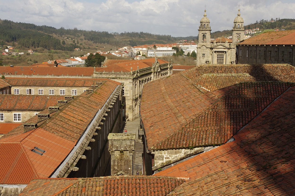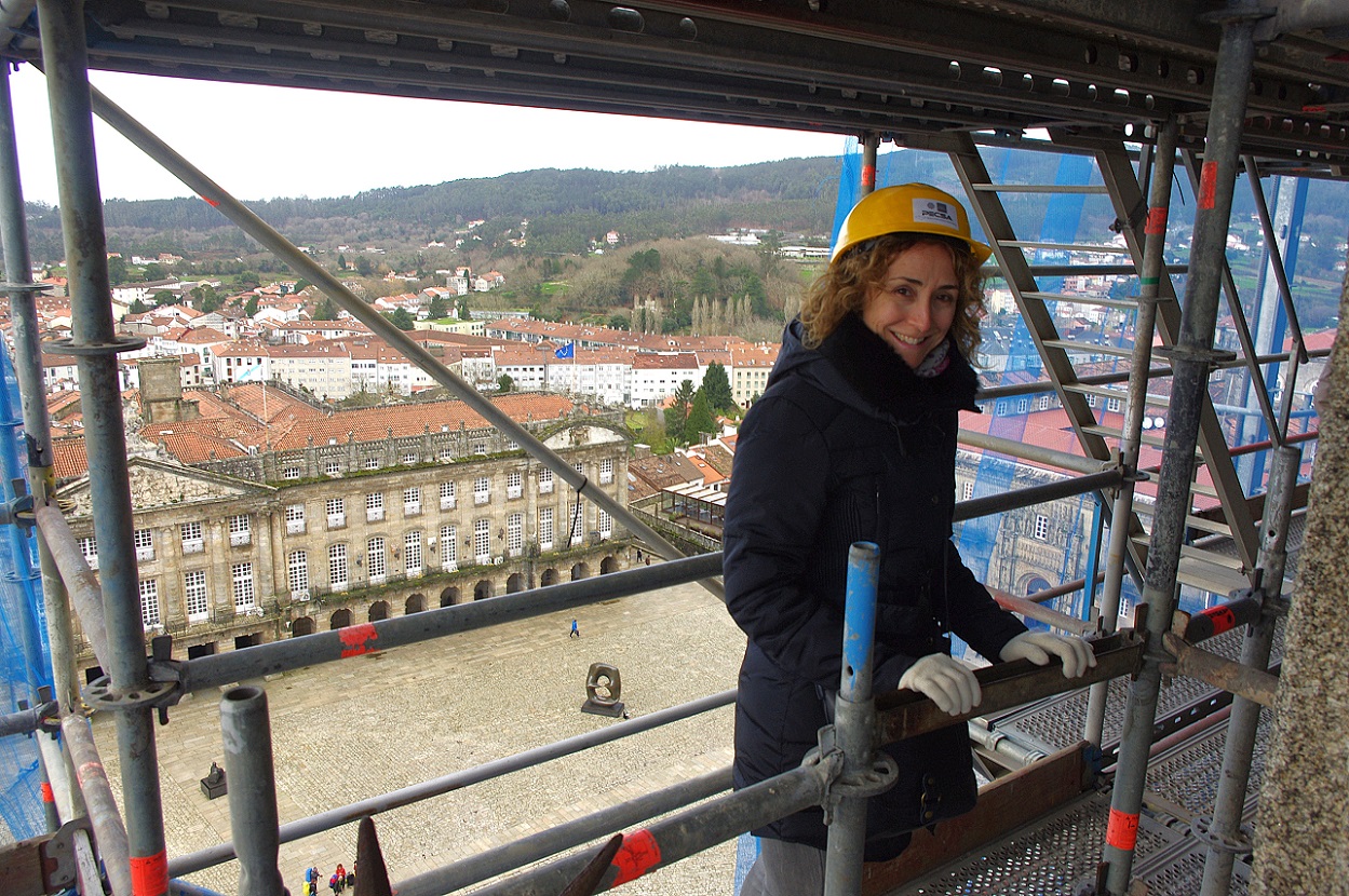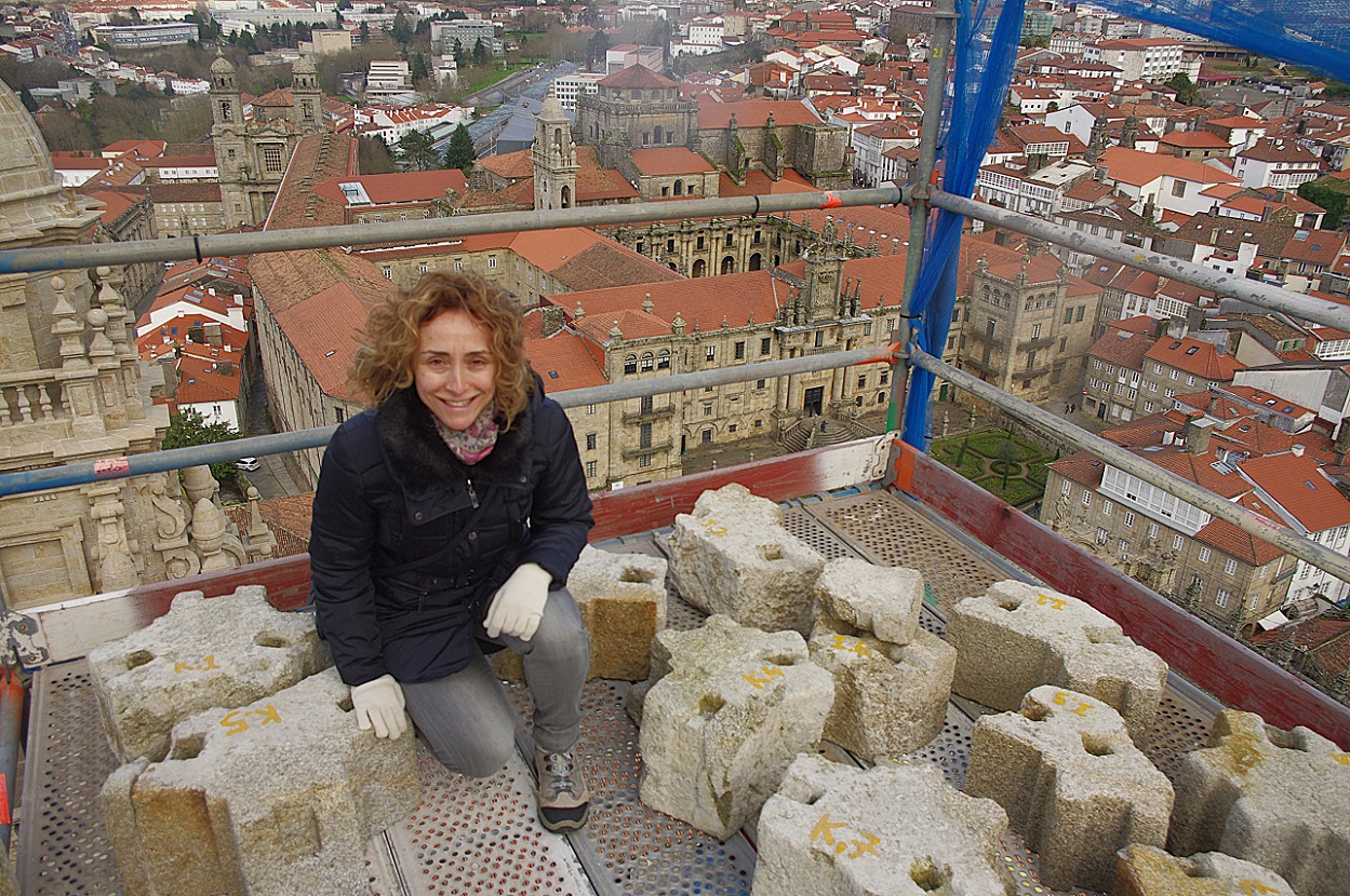 Y a la hora convenida, empezamos nuestra visita a la catedral, ascendiendo poco a poco por los andamios exteriores. Abajo a la izquierda, una magnífica vista, aún a poca altura, sobre los edificios al norte de la catedral. Gran parte de los tejados rojos corresponden al monasterio de San Martín Pinario, y al fondo se ve la iglesia con sus dos torres del convento de San Francisco, y justo a la izquierda, la enorme y monumental facultad de Medicina.