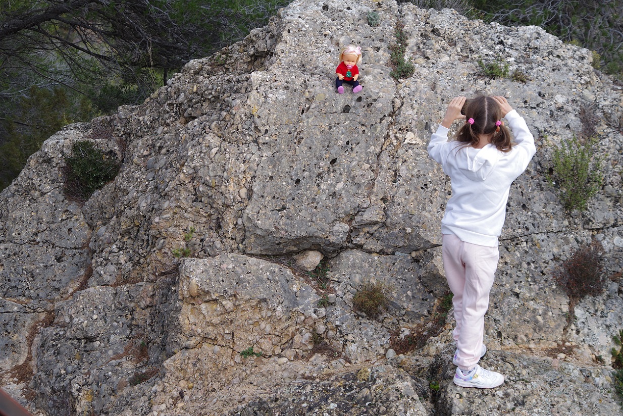 Arriba, igual que a nosotros nos encanta sacar fotos a Inés, a ella le gusta de la misma manera sacar fotos a su bebé. De mayor tiene pinta de que será aficionada a la fotografía, como sus padres. Las fotos de abajo, desde este mirador hay muy buena vista del pueblo de Ulldemolins, por donde teníamos que pasar camino de Siurana.