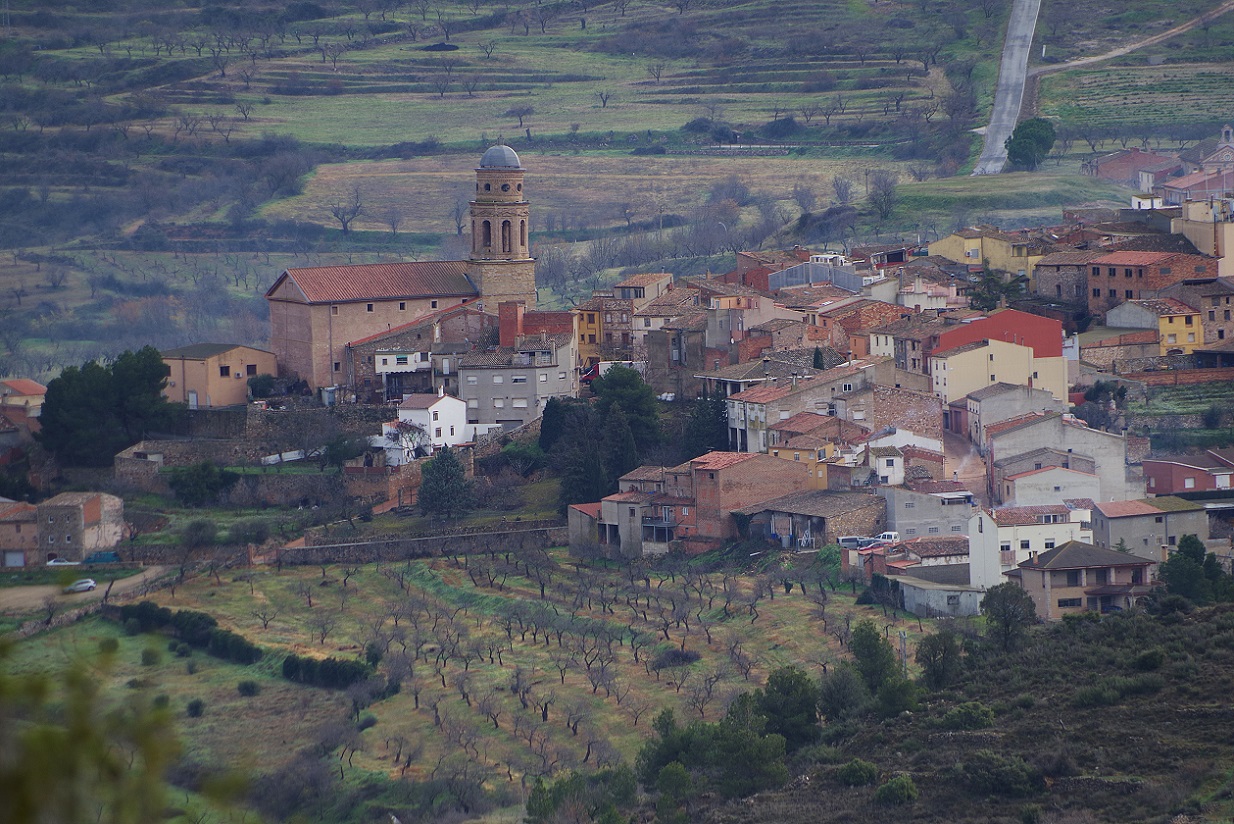 No se puede llegar en coche hasta el mismo Siurana. Como 500 metros antes del pueblo, hay una zona amplia de aparcamiento, que es de pago (creo recordar que pagamos 3 euros). Desde ahí, vamos dando un paseo hasta el pueblo. Por el camino hay buenas vistas, tanto hacia el pueblo como hacia la sierra, ya que estamos en lo alto de la montaña. Abajo a la izquierda podéis ver el pueblo de Siurana, visto desde la zona de aparcamiento, y a la derecha la carreterilla que nos ha traído hasta aquí.